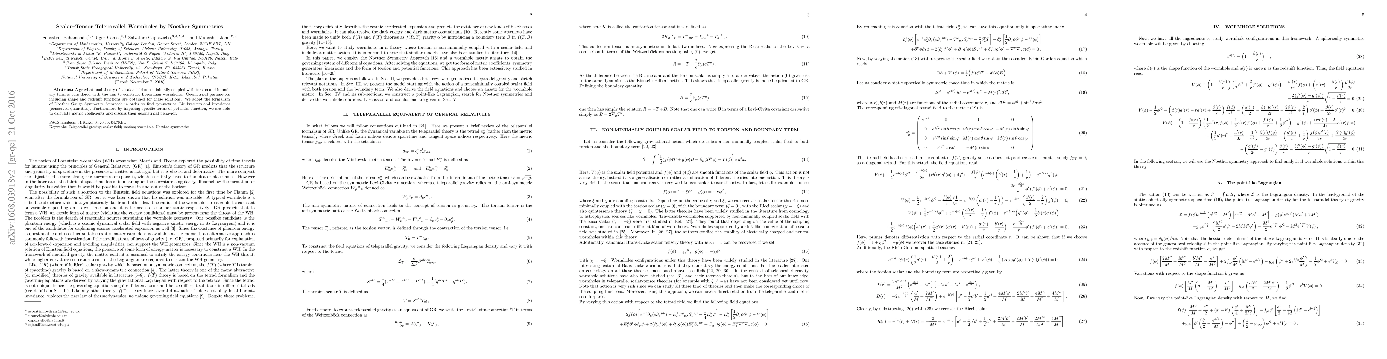 A gravitational theory of a scalar field non-minimally coupled with torsion and boundary term is considered with the aim to construct Lorentzian wormholes. Geometrical parameters including shape and redshift functions are obtained for these solutions. We adopt the formalism of Noether Gauge Symmetry Approach in order to find symmetries, Lie brackets and invariants (conserved quantities). Furthermore by imposing specific forms of potential function, we are able to calculate metric coefficients and discuss their geometrical behavior.