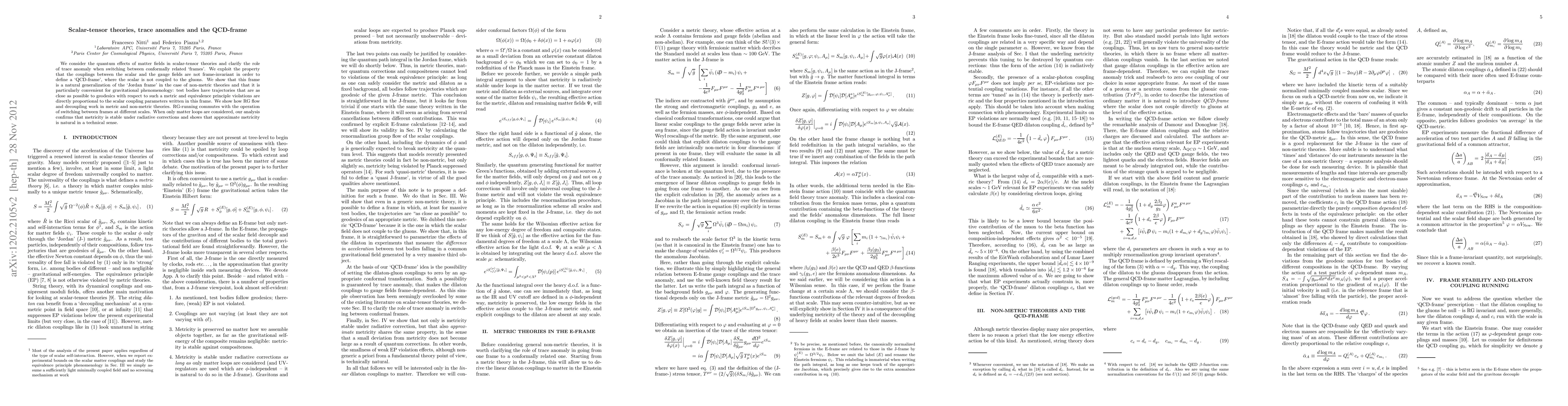 We consider the quantum effects of matter fields in scalar-tensor theories and clarify the role of trace anomaly when switching between conformally related `frames'. We exploit the property that the couplings between the scalar and the gauge fields are not frame-invariant in order to define a `QCD-frame', where the scalar is not coupled to the gluons. We show that this frame is a natural generalization of the `Jordan frame' in the case of non-metric theories and that it is particularly convenient for gravitational phenomenology: test bodies have trajectories that are as close as possible to geodesics with respect to such a metric and equivalence principle violations are directly proportional to the scalar coupling parameters written in this frame. We show how RG flow and decoupling work in metric and non-metric theories. RG-running commutes with the operation of switching between frames at different scales. When only matter loops are considered, our analysis confirms that metricity is stable under radiative corrections and shows that approximate metricity is natural in a technical sense.