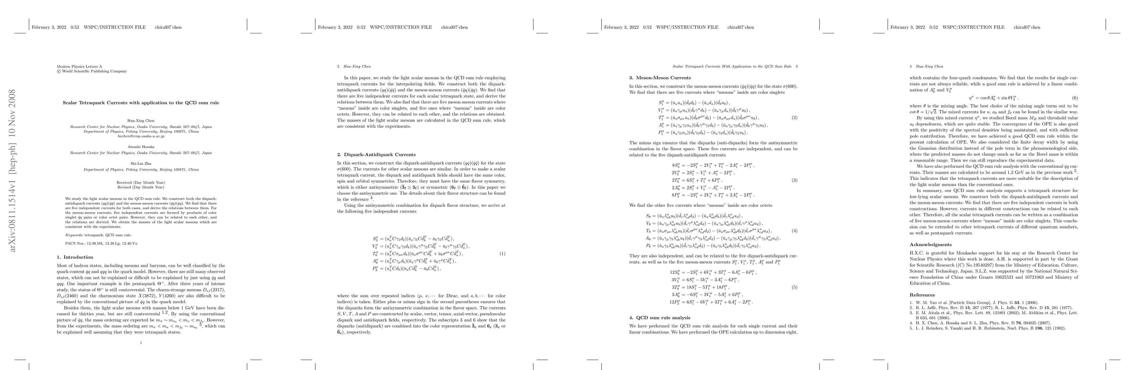 We study the light scalar mesons in the QCD sum rule. We construct both the diquark-antidiquark currents $(qq)(\bar q \bar q)$ and the meson-meson currents $(\bar qq)(\bar qq)$. We find that there are five independent currents for both cases, and derive the relations between them. For the meson-meson currents, five independent currents are formed by products of color singlet $\bar q q$ pairs or color octet pairs. However, they can be related to each other, and the relations are derived. We obtain the masses of the light scalar mesons which are consistent with the experiments.