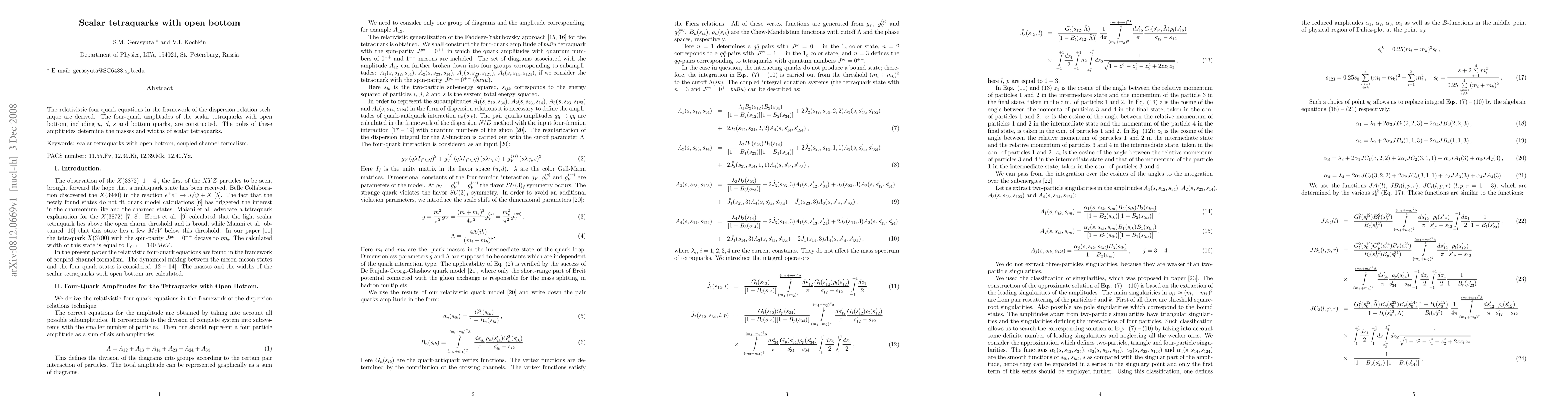 The relativistic four-quark equations in the framework of the dispersion relation technique are derived. The four-quark amplitudes of the scalar tetraquarks with open bottom, including u, d, s and bottom quarks, are constructed. The poles of these amplitudes determine the masses and widths of scalar tetraquarks.