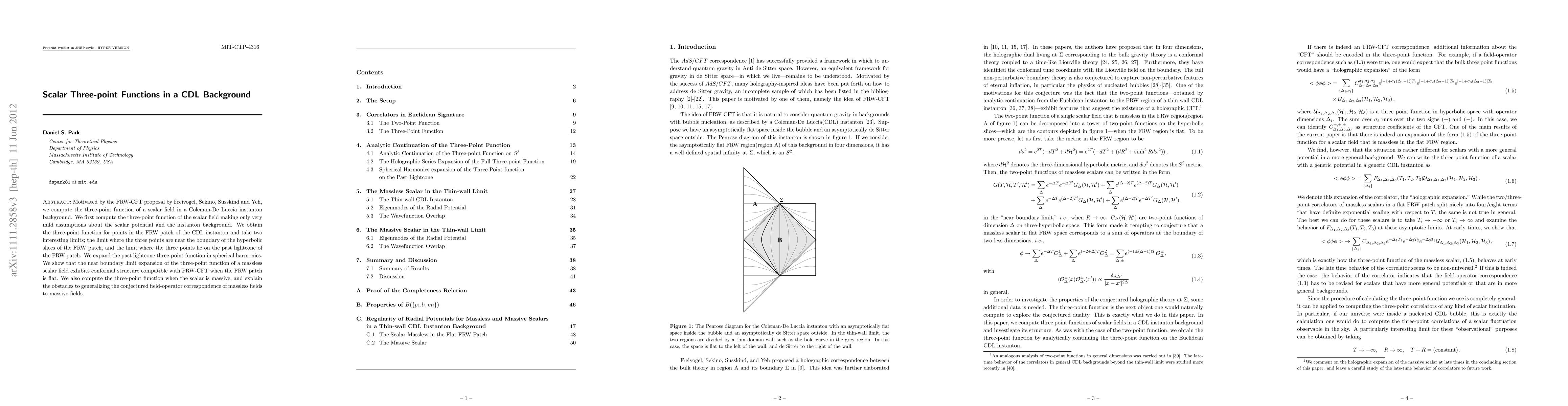 Motivated by the FRW-CFT proposal by Freivogel, Sekino, Susskind and Yeh, we compute the three-point function of a scalar field in a Coleman-De Luccia instanton background. We first compute the three-point function of the scalar field making only very mild assumptions about the scalar potential and the instanton background. We obtain the three-point function for points in the FRW patch of the CDL instanton and take two interesting limits; the limit where the three points are near the boundary of the hyperbolic slices of the FRW patch, and the limit where the three points lie on the past lightcone of the FRW patch. We expand the past lightcone three-point function in spherical harmonics. We show that the near boundary limit expansion of the three-point function of a massless scalar field exhibits conformal structure compatible with FRW-CFT when the FRW patch is flat. We also compute the three-point function when the scalar is massive, and explain the obstacles to generalizing the conjectured field-operator correspondence of massless fields to massive fields.