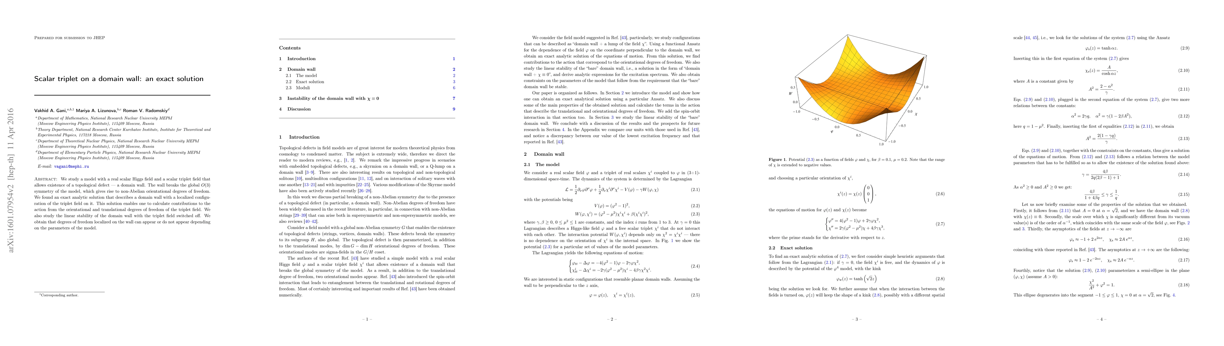 We study a model with a real scalar Higgs field and a scalar triplet field that allows existence of a topological defect -- a domain wall. The wall breaks the global $O(3)$ symmetry of the model, which gives rise to non-Abelian orientational degrees of freedom. We found an exact analytic solution that describes a domain wall with a localized configuration of the triplet field on it. This solution enables one to calculate contributions to the action from the orientational and translational degrees of freedom of the triplet field. We also study the linear stability of the domain wall with the triplet field switched off. We obtain that degrees of freedom localized on the wall can appear or do not appear depending on the parameters of the model.