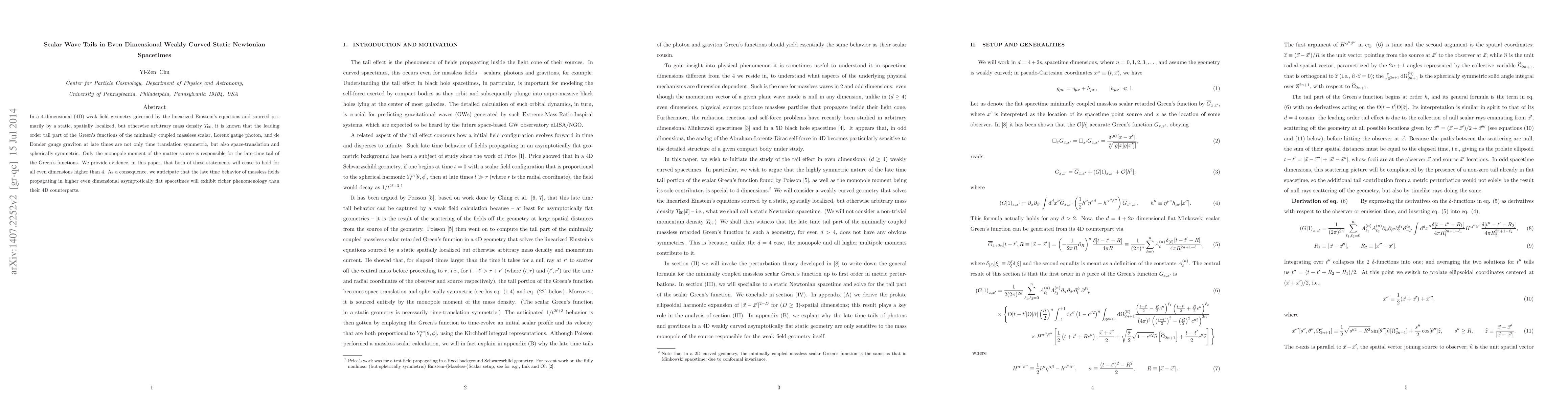 In a 4-dimensional (4D) weak field geometry governed by the linearized Einstein's equations and sourced primarily by a static, spatially localized, but otherwise arbitrary mass density $T_{00}$, it is known that the leading order tail part of the Green's functions of the minimally coupled massless scalar, Lorenz gauge photon, and de Donder gauge graviton at late times are not only time translation symmetric, but also space-translation and spherically symmetric. Only the monopole moment of the matter source is responsible for the late-time tail of the Green's functions. We provide evidence, in this paper, that both of these statements will cease to hold for all even dimensions higher than 4. As a consequence, we anticipate that the late time behavior of massless fields propagating in higher even dimensional asymptotically flat spacetimes will exhibit richer phenomenology than their 4D counterparts.
