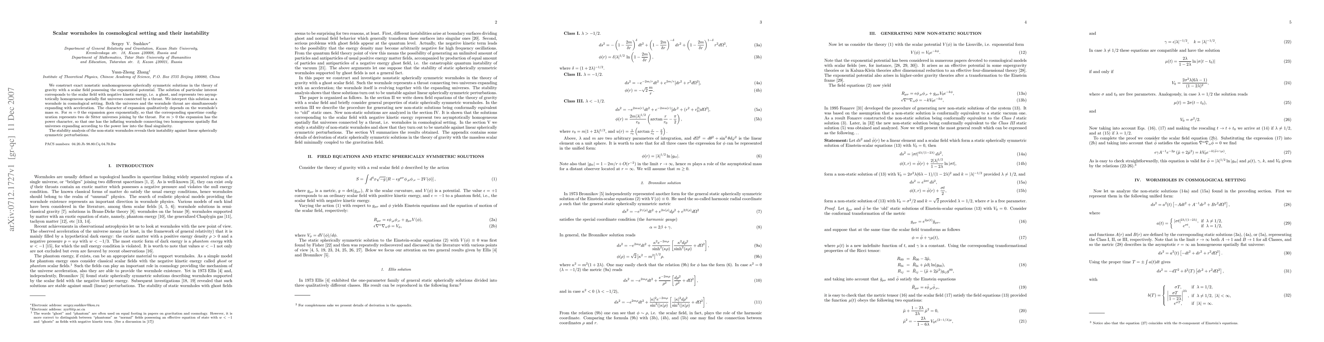 This paper constructs exact solutions for scalar wormholes in a cosmological setting with an exponential scalar field potential, showing that they connect two expanding universes. The wormholes exhibit instability against linear perturbations, with expansion dynamics varying based on the wormhole's mass.