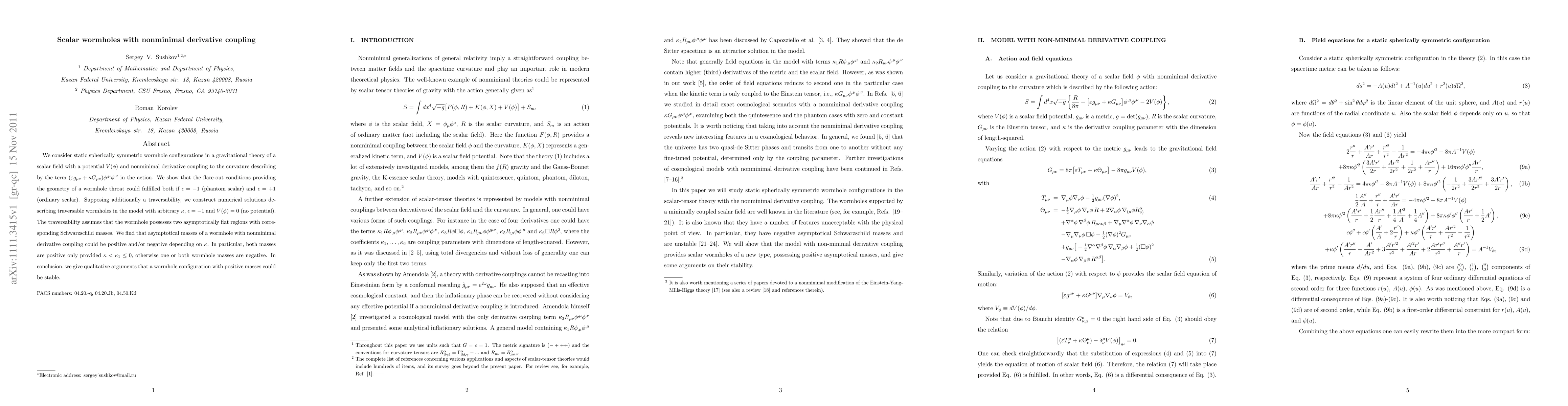 This research explores static spherically symmetric wormholes in a scalar field theory with nonminimal derivative coupling. It finds that flare-out conditions can be met for both phantom and ordinary scalars, and constructs traversable wormholes under certain conditions, with masses depending on the coupling parameter. The study suggests that wormholes with positive masses may be stable.