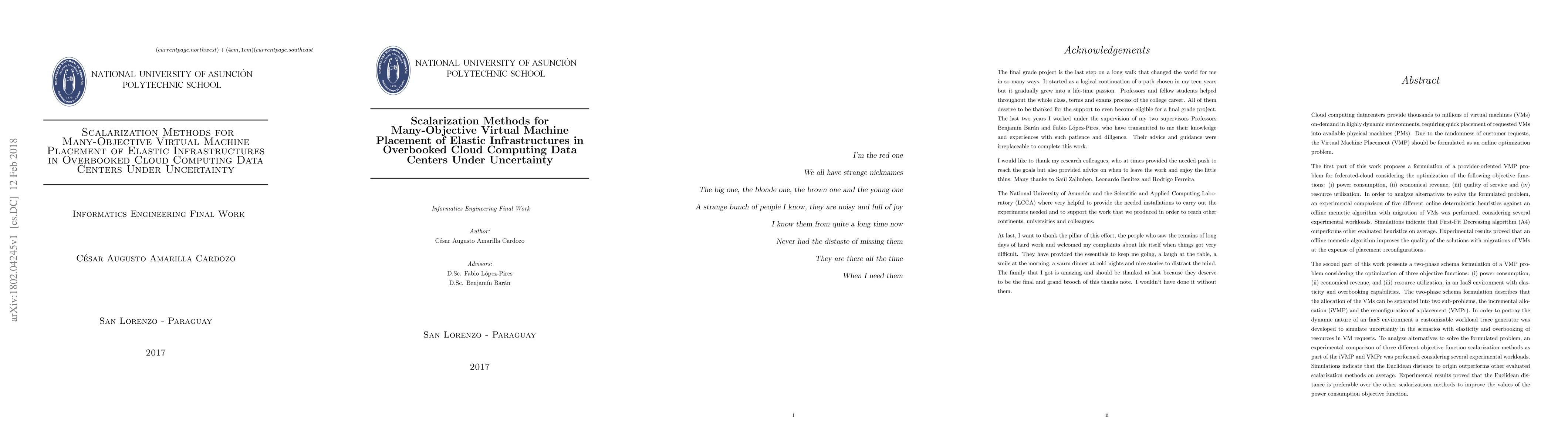 Cloud computing datacenters provide thousands to millions of virtual machines (VMs) on-demand in highly dynamic environments, requiring quick placement of requested VMs into available physical machines (PMs). Due to the randomness of customer requests, the Virtual Machine Placement (VMP) should be formulated as an online optimization problem. The first part of this work analyzes alternatives to solve the formulated problem, an experimental comparison of five different online deterministic heuristics against an offline memetic algorithm with migration of VMs was performed, considering several experimental workloads. Simulations indicate that First-Fit Decreasing algorithm (A4) outperforms other evaluated heuristics on average. This work presents a two-phase schema formulation of a VMP problem considering the optimization of three objective functions in an IaaS environment with elasticity and overbooking capabilities. The two-phase schema formulation describes that the allocation of the VMs can be separated into two sub-problems, the incremental allocation (iVMP) and the reconfiguration of a placement (VMPr). To analyze alternatives to solve the formulated problem, an experimental comparison of three different objective function scalarization methods as part of the iVMP and VMPr was performed considering several experimental workloads. Simulations indicate that the Euclidean distance to origin outperforms other evaluated scalarization methods on average. In order to portray the dynamic nature of an IaaS environment a customizable workload trace generator was developed to simulate uncertainty in the scenarios with elasticity and overbooking of resources in VM requests. Experimental results proved that the Euclidean distance is preferable over the other scalarizatiom methods to improve the values of the power consumption objective function.