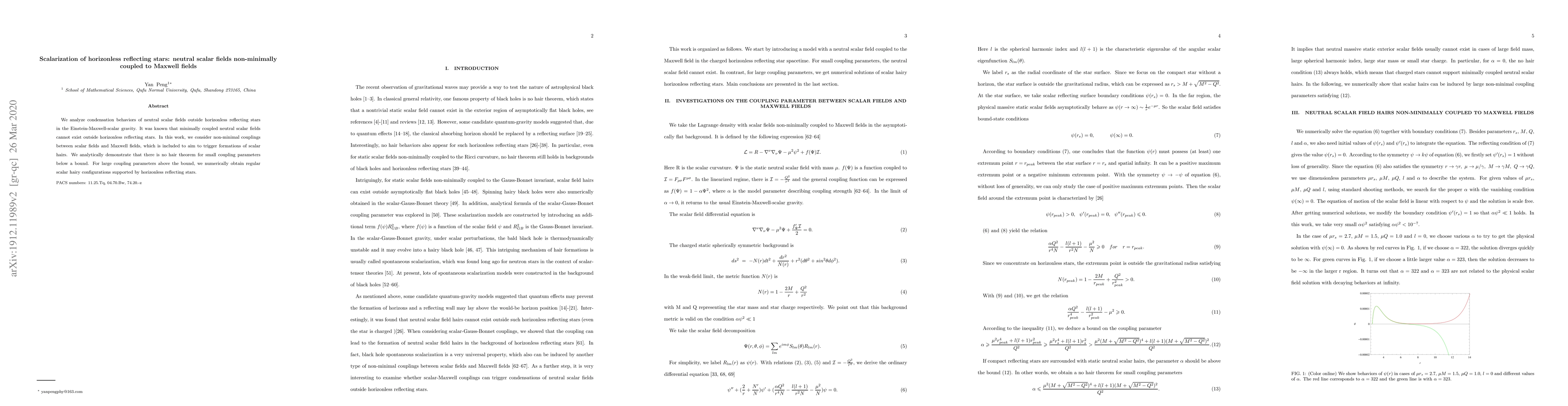 We analyze condensation behaviors of neutral scalar fields outside horizonless reflecting stars in the Einstein-Maxwell-scalar gravity. It was known that minimally coupled neutral scalar fields cannot exist outside horizonless reflecting stars. In this work, we consider non-minimal couplings between scalar fields and Maxwell fields, which is included to aim to trigger formations of scalar hairs. We analytically demonstrate that there is no hair theorem for small coupling parameters below a bound. For large coupling parameters above the bound, we numerically obtain regular scalar hairy configurations supported by horizonless reflecting stars.