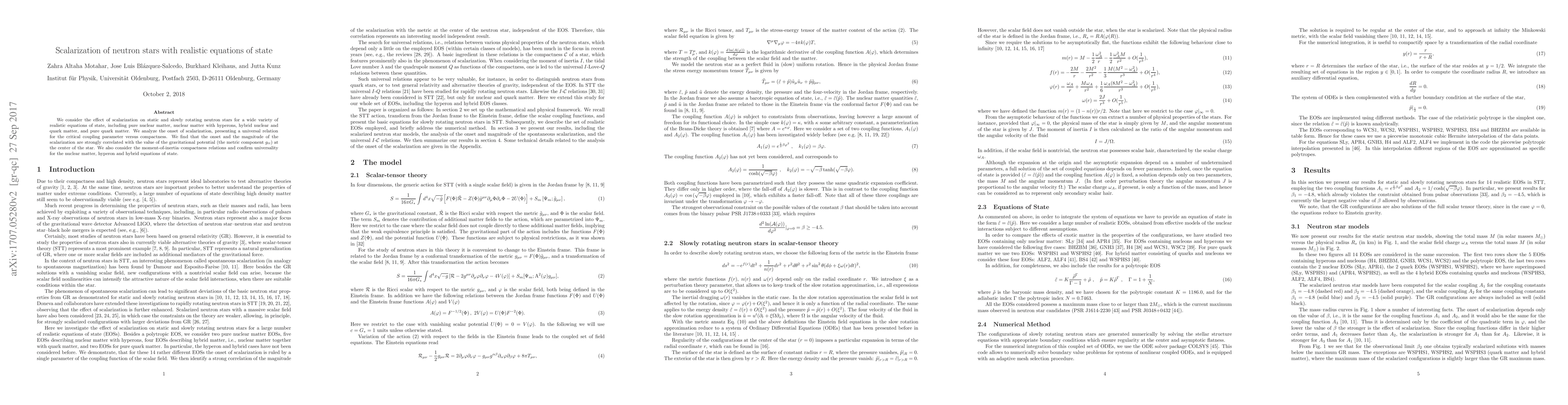 This paper investigates scalarization in neutron stars across various realistic equations of state, revealing a universal relation for the critical coupling parameter versus compactness. The study finds a strong correlation between scalarization onset and the gravitational potential at the star's center, and confirms universality in moment-of-inertia--compactness relations for nuclear, hyperon, and hybrid matter.