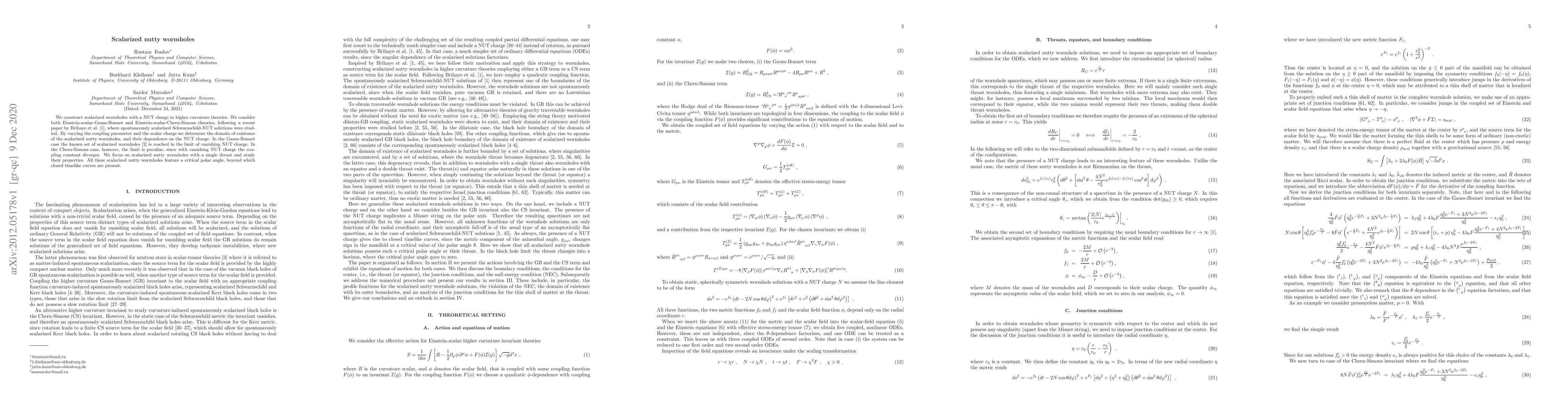 This paper constructs scalarized wormholes with a NUT charge in higher curvature theories, specifically in Einstein-scalar-Gauss-Bonnet and Einstein-scalar-Chern-Simons frameworks. It explores the domain of existence and properties of these wormholes, noting the presence of closed timelike curves beyond a critical polar angle.
