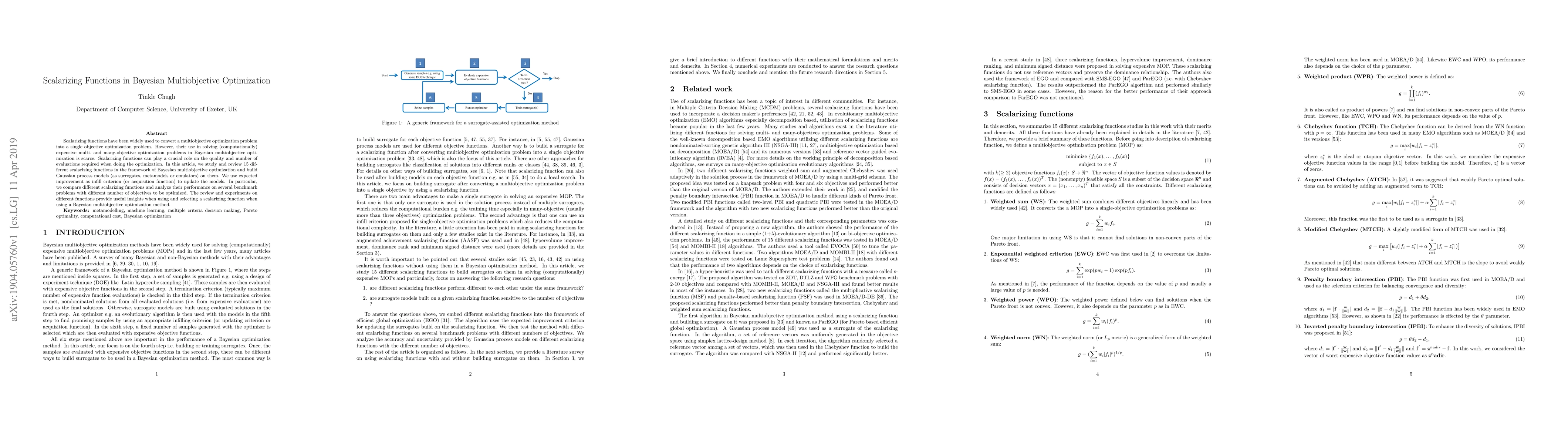 This paper reviews 15 scalarizing functions for Bayesian multiobjective optimization, building Gaussian process models to evaluate them. It compares their performance on benchmark problems, providing insights for selecting appropriate scalarizing functions in computationally expensive optimization scenarios.