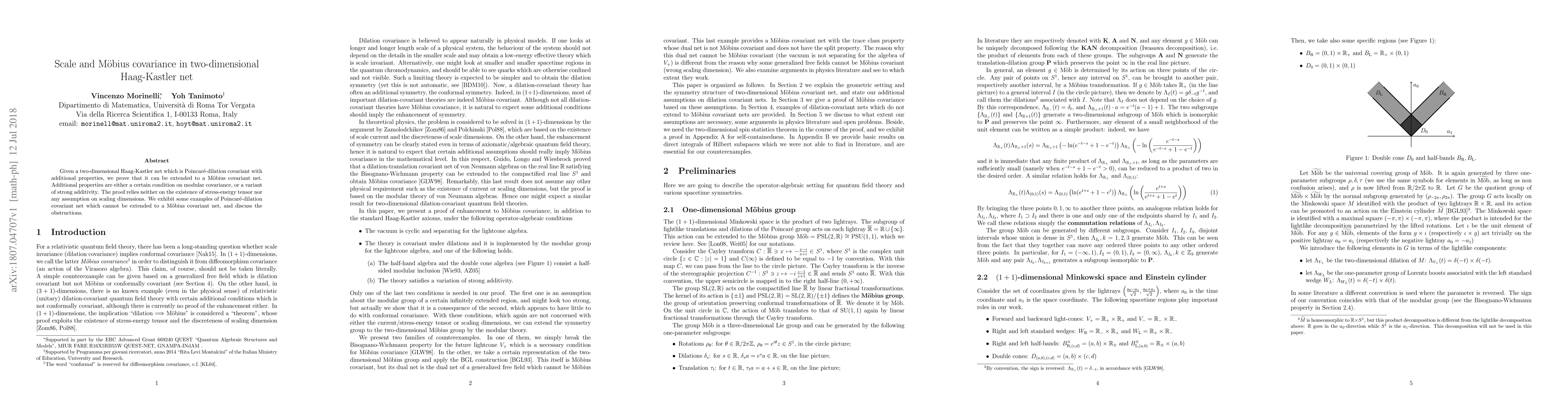 This paper proves that certain two-dimensional Haag-Kastler nets with Poincaré-dilation covariance can be extended to Möbius covariant nets under specific modular covariance or strong additivity conditions. The proof does not rely on stress-energy tensors or scaling dimensions.