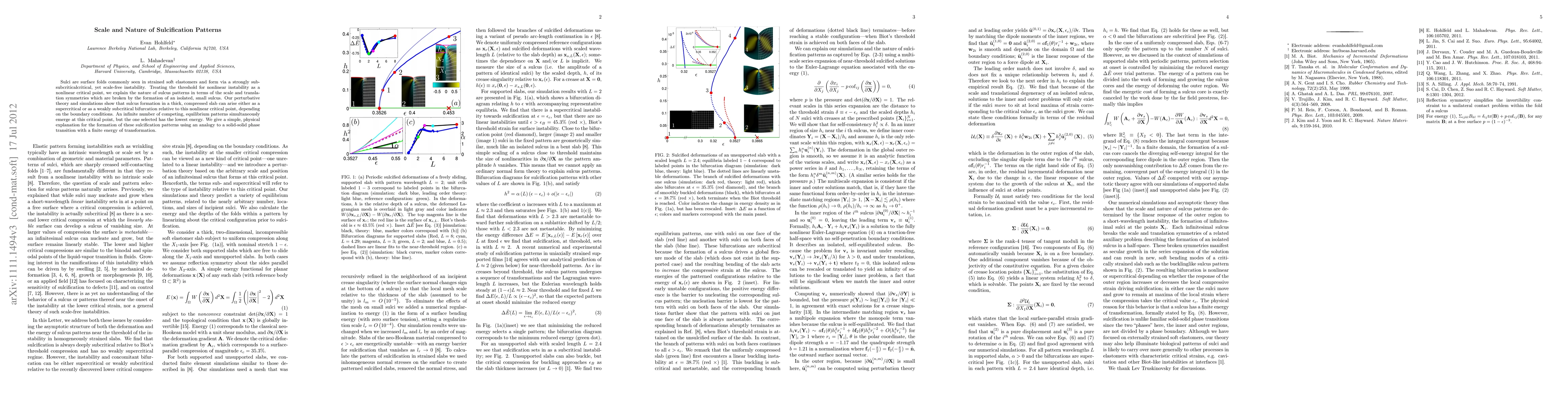 Sulci are surface folds commonly seen in strained soft elastomers and form via a strongly subsubcriticalcritical, yet scale-free instability. Treating the threshold for nonlinear instability as a nonlinear critical point, we explain the nature of sulcus patterns in terms of the scale and translation symmetries which are broken by the formation of an isolated, small sulcus. Our perturbative theory and simulations show that sulcus formation in a thick, compressed slab can arise either as a supercritical or as a weakly subcritical bifurcation relative to this nonlinear critical point, depending on the boundary conditions. An infinite number of competing, equilibrium patterns simultaneously emerge at this critical point, but the one selected has the lowest energy. We give a simple, physical explanation for the formation of these sulcification patterns using an analogy to a solid-solid phase transition with a finite energy of transformation.