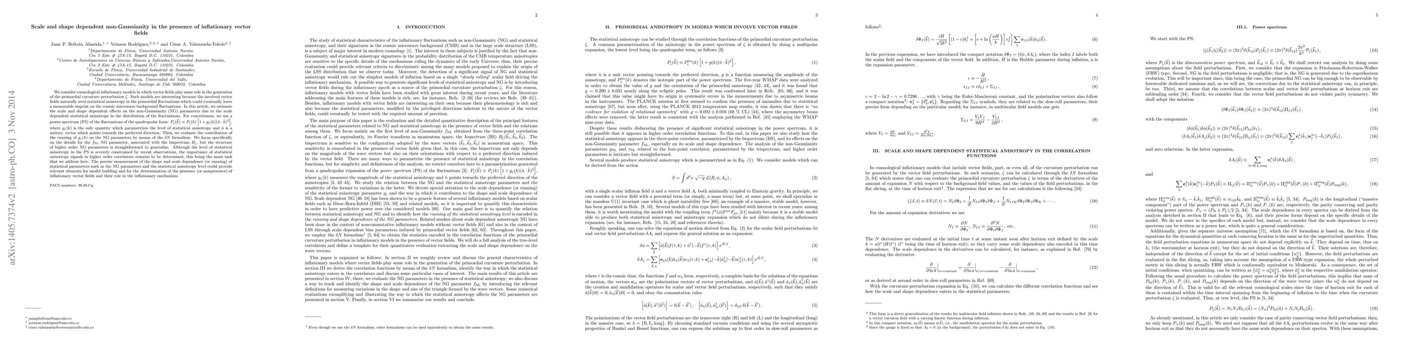 This paper investigates the impact of inflationary vector fields on the non-Gaussianity (NG) in primordial curvature perturbations, focusing on scale and shape dependent effects. It uses a quadrupolar power spectrum model to quantify the statistical anisotropy and evaluates the running of anisotropy on the $f_{\rm NL}$ parameter, aiming to determine the significance of these effects for model building and inflationary vector field detection.