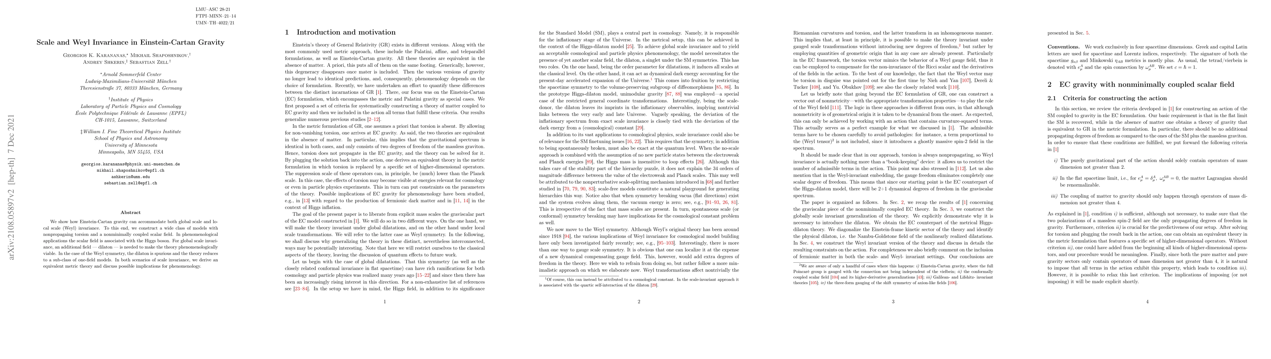 This paper demonstrates how Einstein-Cartan gravity can incorporate both global scale and local Weyl invariance through models with nonpropagating torsion and a nonminimally coupled scalar field, potentially linked to the Higgs boson. For global scale invariance, a dilaton field is required for phenomenological viability, while for local Weyl symmetry, the dilaton is redundant, simplifying the theory.