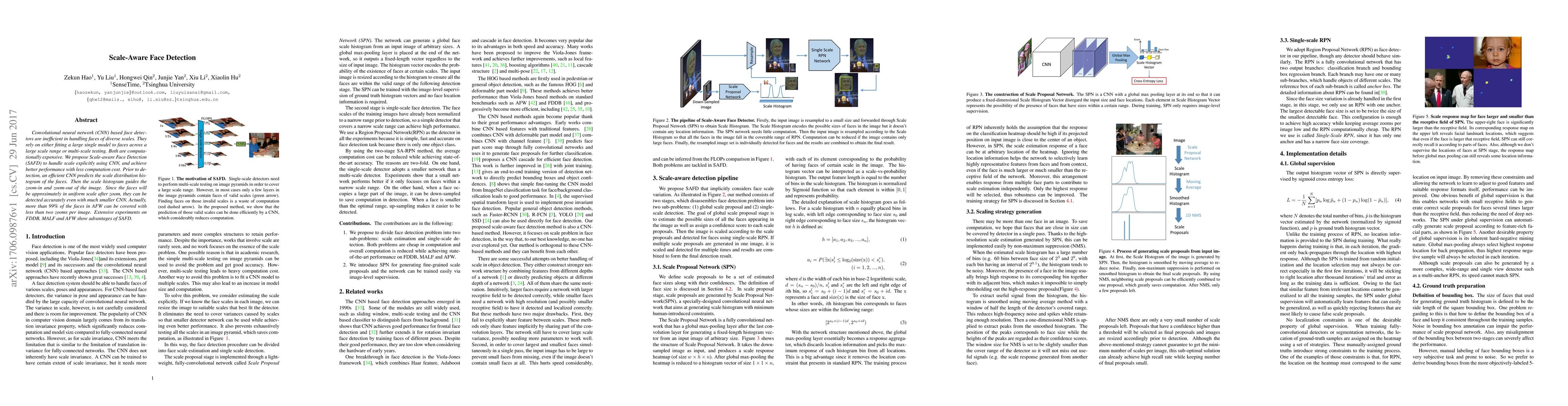 The Scale-Aware Face Detector (SAFD) proposes an efficient CNN-based method to handle faces of diverse scales by predicting scale distribution histograms, guiding image zooms, and enabling accurate detection with smaller CNNs. Experiments demonstrate SAFD's superior performance and lower computational cost compared to traditional methods.