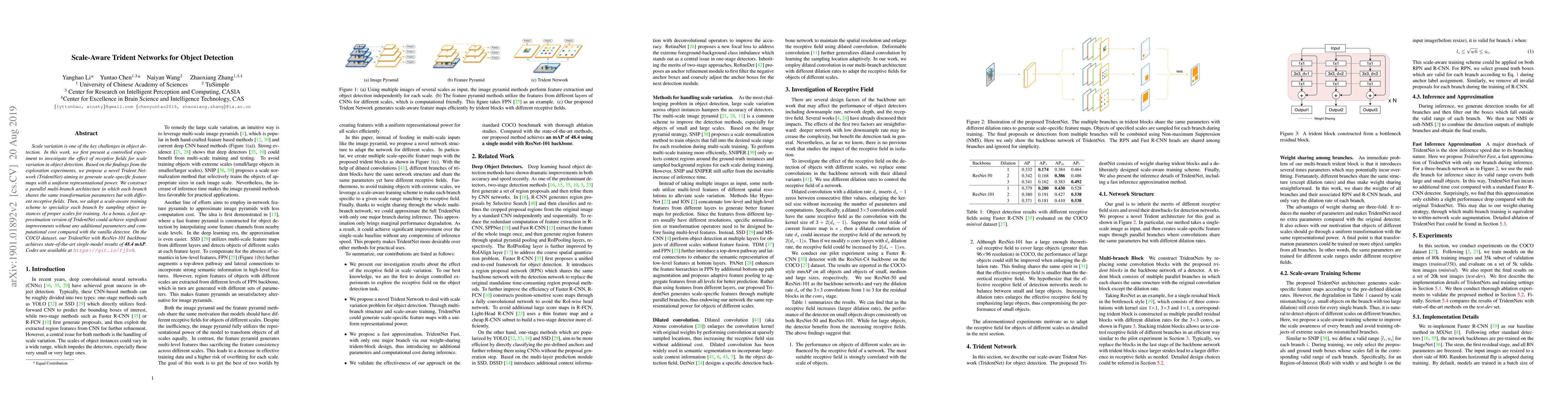 This paper proposes a novel Trident Network (TridentNet) to address scale variation in object detection by generating scale-specific feature maps with uniform representational power. The TridentNet employs a parallel multi-branch architecture with different receptive fields, trained using a scale-aware scheme, achieving state-of-the-art results on the COCO dataset.