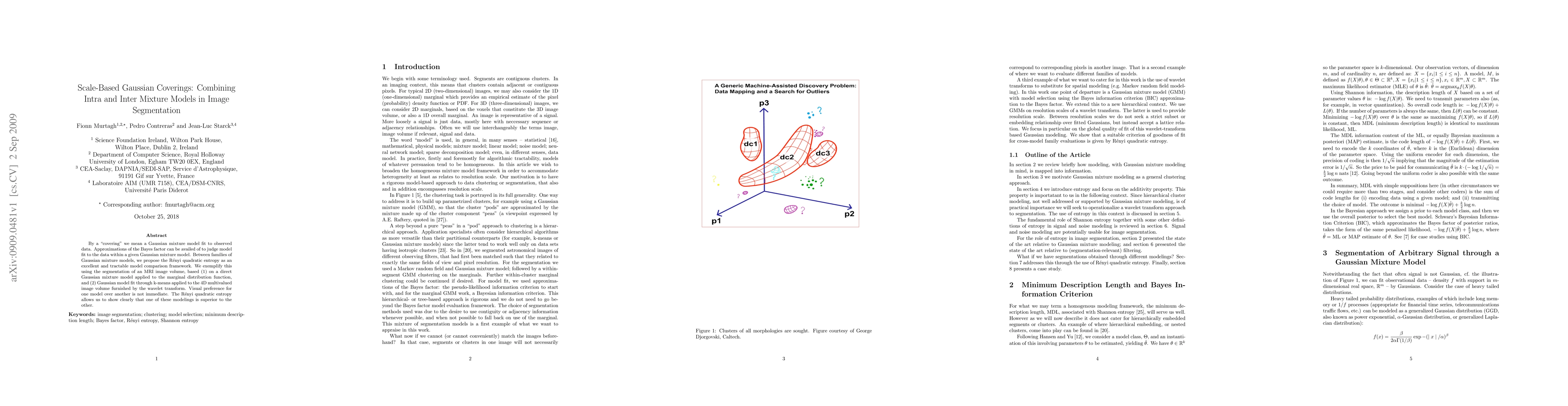 By a "covering" we mean a Gaussian mixture model fit to observed data. Approximations of the Bayes factor can be availed of to judge model fit to the data within a given Gaussian mixture model. Between families of Gaussian mixture models, we propose the R\'enyi quadratic entropy as an excellent and tractable model comparison framework. We exemplify this using the segmentation of an MRI image volume, based (1) on a direct Gaussian mixture model applied to the marginal distribution function, and (2) Gaussian model fit through k-means applied to the 4D multivalued image volume furnished by the wavelet transform. Visual preference for one model over another is not immediate. The R\'enyi quadratic entropy allows us to show clearly that one of these modelings is superior to the other.