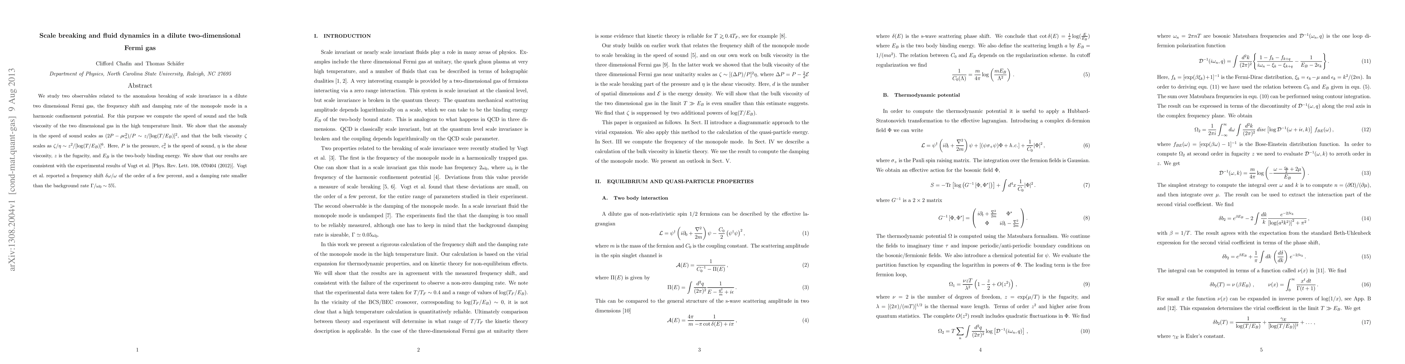 This paper investigates the anomalous breaking of scale invariance in a dilute two-dimensional Fermi gas by analyzing the frequency shift and damping rate of the monopole mode. It computes the speed of sound and bulk viscosity, showing that these anomalies scale with temperature and binding energy, and aligns with experimental results from Vogt et al.
