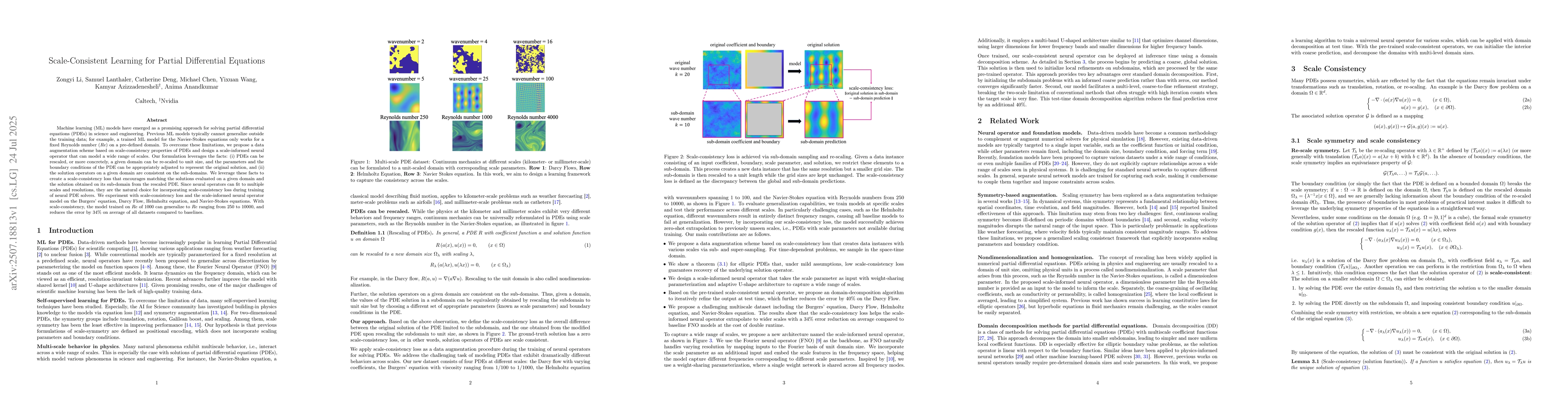 Machine learning (ML) models have emerged as a promising approach for solving partial differential equations (PDEs) in science and engineering. Previous ML models typically cannot generalize outside the training data; for example, a trained ML model for the Navier-Stokes equations only works for a fixed Reynolds number ($Re$) on a pre-defined domain. To overcome these limitations, we propose a data augmentation scheme based on scale-consistency properties of PDEs and design a scale-informed neural operator that can model a wide range of scales. Our formulation leverages the facts: (i) PDEs can be rescaled, or more concretely, a given domain can be re-scaled to unit size, and the parameters and the boundary conditions of the PDE can be appropriately adjusted to represent the original solution, and (ii) the solution operators on a given domain are consistent on the sub-domains. We leverage these facts to create a scale-consistency loss that encourages matching the solutions evaluated on a given domain and the solution obtained on its sub-domain from the rescaled PDE. Since neural operators can fit to multiple scales and resolutions, they are the natural choice for incorporating scale-consistency loss during training of neural PDE solvers. We experiment with scale-consistency loss and the scale-informed neural operator model on the Burgers' equation, Darcy Flow, Helmholtz equation, and Navier-Stokes equations. With scale-consistency, the model trained on $Re$ of 1000 can generalize to $Re$ ranging from 250 to 10000, and reduces the error by 34% on average of all datasets compared to baselines.