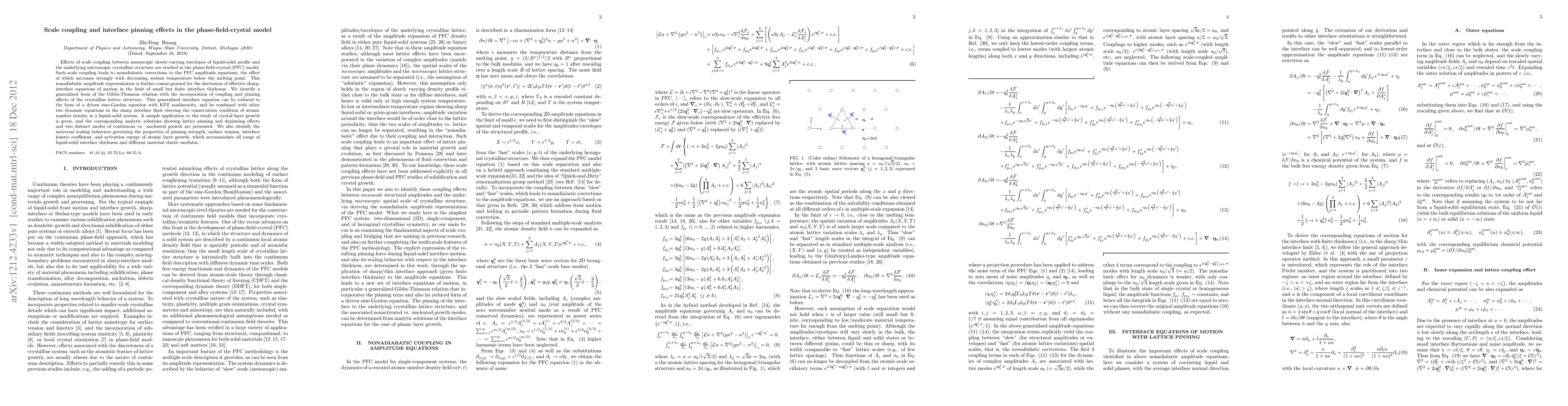 This paper investigates the effects of scale coupling in the phase-field-crystal model, deriving effective sharp-interface equations that incorporate lattice pinning and nonadiabatic corrections. It identifies universal scaling behaviors for pinning strength, surface tension, and growth kinetics, and demonstrates applications to crystal layer growth with distinct growth modes.