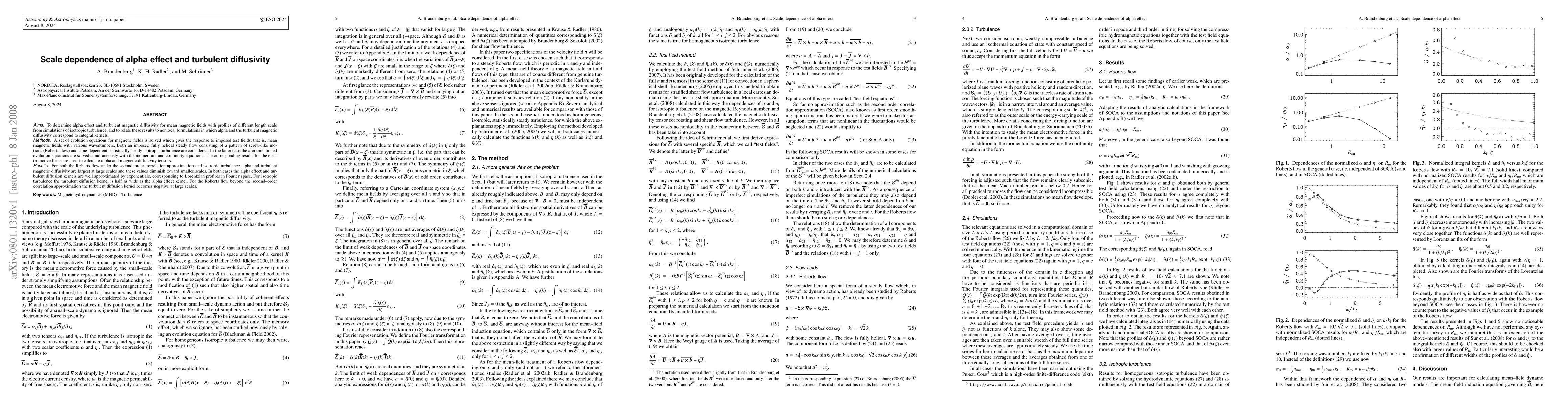 This paper investigates the alpha effect and turbulent magnetic diffusivity in isotropic turbulence and Roberts flow, finding that both are largest at large scales and diminish at smaller scales. The results suggest that these quantities can be well approximated by exponential kernels, with the turbulent diffusion kernel being narrower for isotropic turbulence.