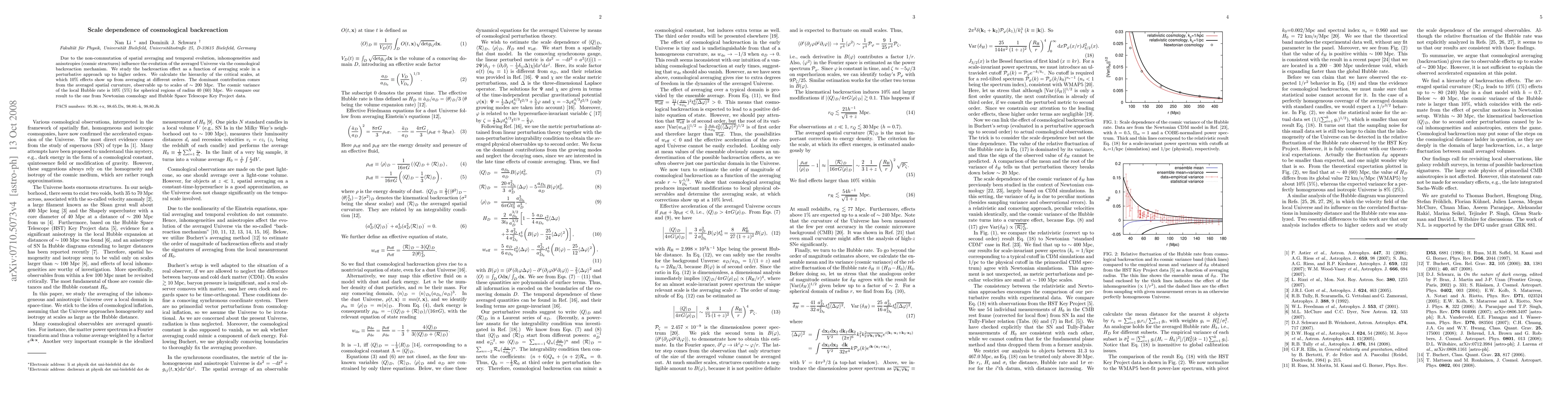 Due to the non-commutation of spatial averaging and temporal evolution, inhomogeneities and anisotropies (cosmic structures) influence the evolution of the averaged Universe via the cosmological backreaction mechanism. We study the backreaction effect as a function of averaging scale in a perturbative approach up to higher orders. We calculate the hierarchy of the critical scales, at which 10% effects show up from averaging at different orders. The dominant contribution comes from the averaged spatial curvature, observable up to scales of 200 Mpc. The cosmic variance of the local Hubble rate is 10% (5%) for spherical regions of radius 40 (60) Mpc. We compare our result to the one from Newtonian cosmology and Hubble Space Telescope Key Project data.