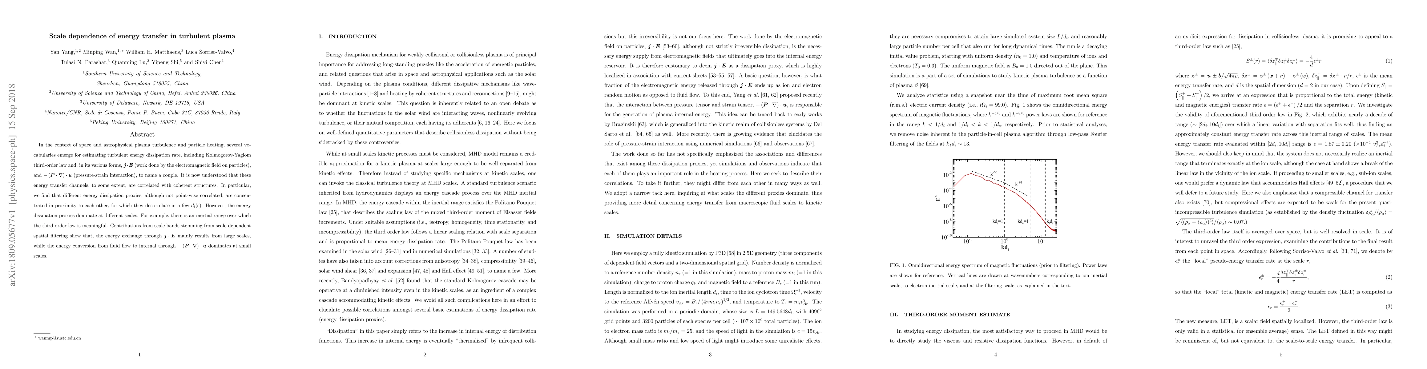 In the context of space and astrophysical plasma turbulence and particle heating, several vocabularies emerge for estimating turbulent energy dissipation rate, including Kolmogorov-Yaglom third-order law and, in its various forms, $\boldsymbol{j}\cdot\boldsymbol{E}$ (work done by the electromagnetic field on particles), and $-\left( \boldsymbol{P} \cdot \nabla \right) \cdot \boldsymbol{u}$ (pressure-strain interaction), to name a couple. It is now understood that these energy transfer channels, to some extent, are correlated with coherent structures. In particular, we find that different energy dissipation proxies, although not point-wise correlated, are concentrated in proximity to each other, for which they decorrelate in a few $d_i$(s). However, the energy dissipation proxies dominate at different scales. For example, there is an inertial range over which the third-order law is meaningful. Contributions from scale bands stemming from scale-dependent spatial filtering show that, the energy exchange through $\boldsymbol{j}\cdot\boldsymbol{E}$ mainly results from large scales, while the energy conversion from fluid flow to internal through $-\left( \boldsymbol{P} \cdot \nabla \right) \cdot \boldsymbol{u}$ dominates at small scales.