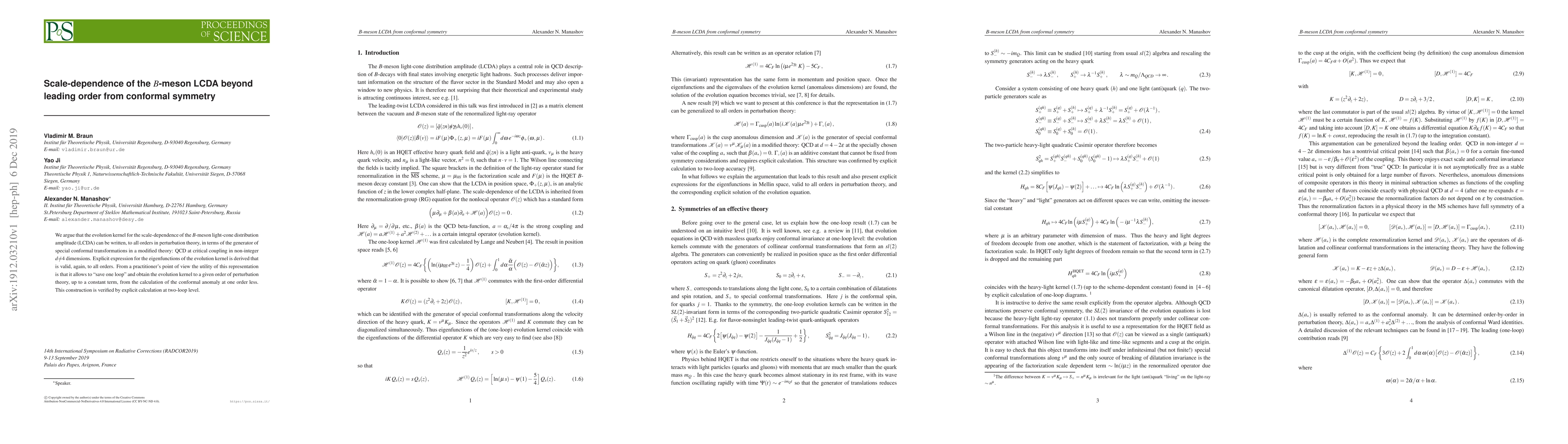 We argue that the evolution kernel for the scale-dependence of the $B$-meson light-cone distribution amplitude (LCDA) can be written, to all orders in perturbation theory, in terms of the generator of special conformal transformations in a modified theory: QCD at critical coupling in non-integer $d\neq 4$ dimensions. Explicit expression for the eigenfunctions of the evolution kernel is derived that is valid, again, to all orders. From a practitioner's point of view the utility of this representation is that it allows to "save one loop" and obtain the evolution kernel to a given order of perturbation theory, up to a constant term, from the calculation of the conformal anomaly at one order less. This construction is verified by explicit calculation at two-loop level.