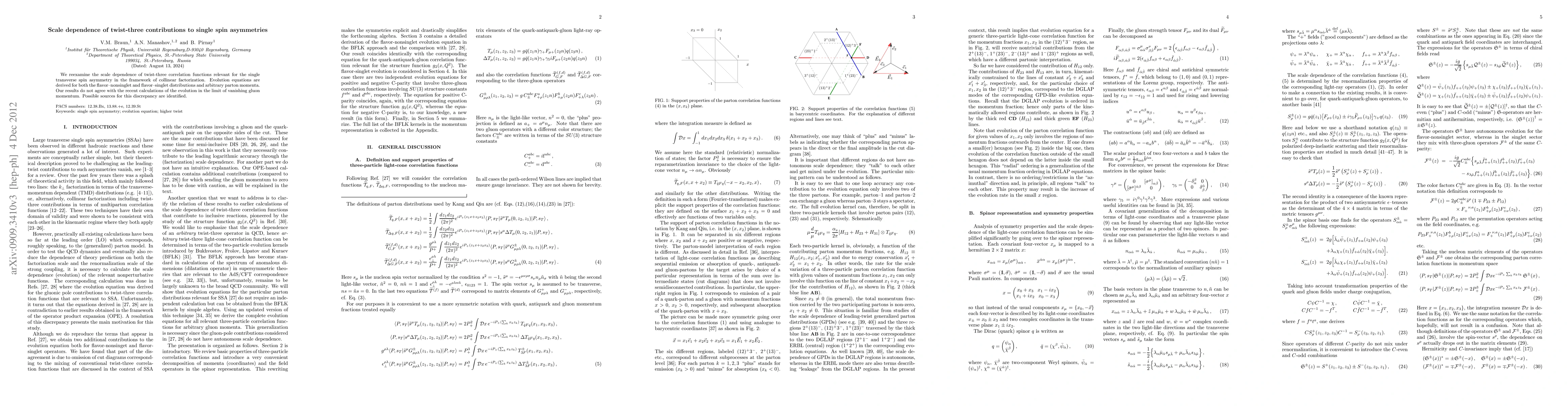 We reexamine the scale dependence of twist-three correlation functions relevant for the single transverse spin asymmetry in the framework of collinear factorization. Evolution equations are derived for both the flavor-nonsinglet and flavor--singlet distributions and arbitrary parton momenta. Our results do not agree with the recent calculations of the evolution in the limit of vanishing gluon momentum. Possible sources for this discrepancy are identified.