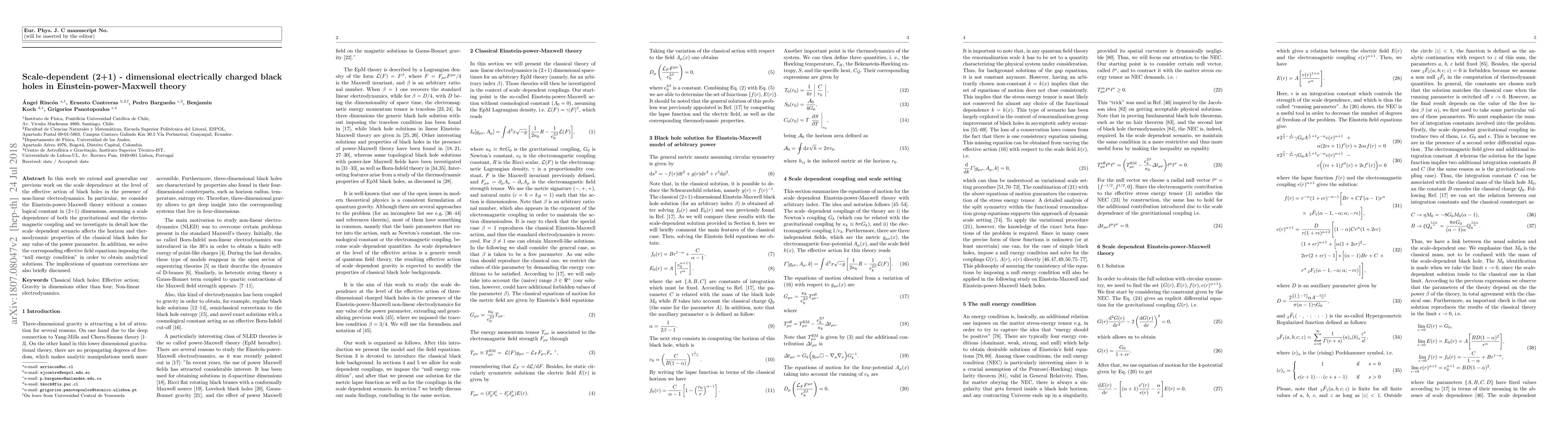In this work we extend and generalize our previous work on the scale dependence at the level of the effective action of black holes in the presence of non-linear electrodynamics. In particular, we consider the Einstein-power-Maxwell theory without a cosmological constant in (2+1) dimensions, assuming a scale dependence of both the gravitational and the electromagnetic coupling and we investigate in detail how the scale--dependent scenario affects the horizon and thermodynamic properties of the classical black holes for any value of the power parameter. In addition, we solve the corresponding effective field equations imposing the "null energy condition" in order to obtain analytical solutions. The implications of quantum corrections are also briefly discussed.