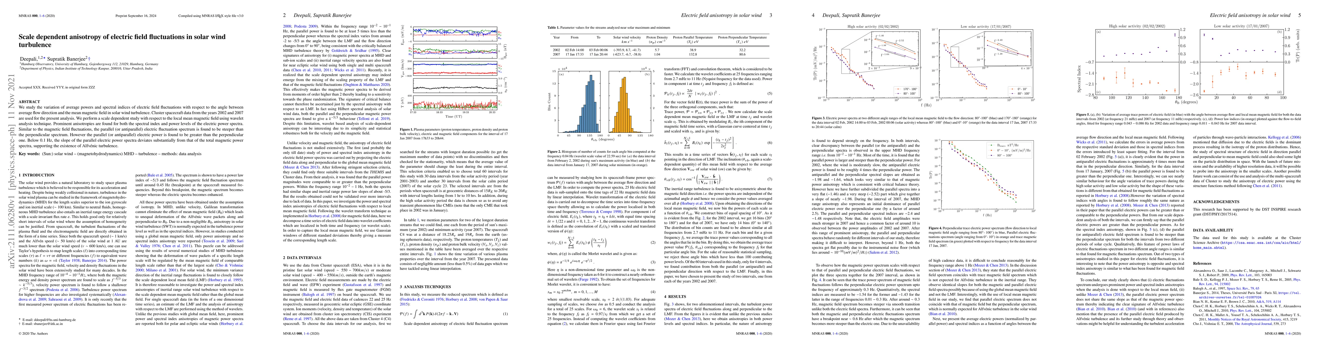 We study the variation of average powers and spectral indices of electric field fluctuations with respect to the angle between average flow direction and the mean magnetic field in solar wind turbulence. Cluster spacecraft data from the years 2002 and 2007 are used for the present analysis. We perform a scale dependent study with respect to the local mean magnetic field using wavelet analysis technique. Prominent anisotropies are found for both the spectral index and power levels of the electric power spectra. Similar to the magnetic field fluctuations, the parallel (or antiparallel) electric fluctuation spectrum is found to be steeper than the perpendicular spectrum. However the parallel (or antiparallel) electric power is found to be greater than the perpendicular one. Below 0.1 Hz, the slope of the parallel electric power spectra deviates substantially from that of the total magnetic power spectra, supporting the existence of Alfv\'enic turbulence.