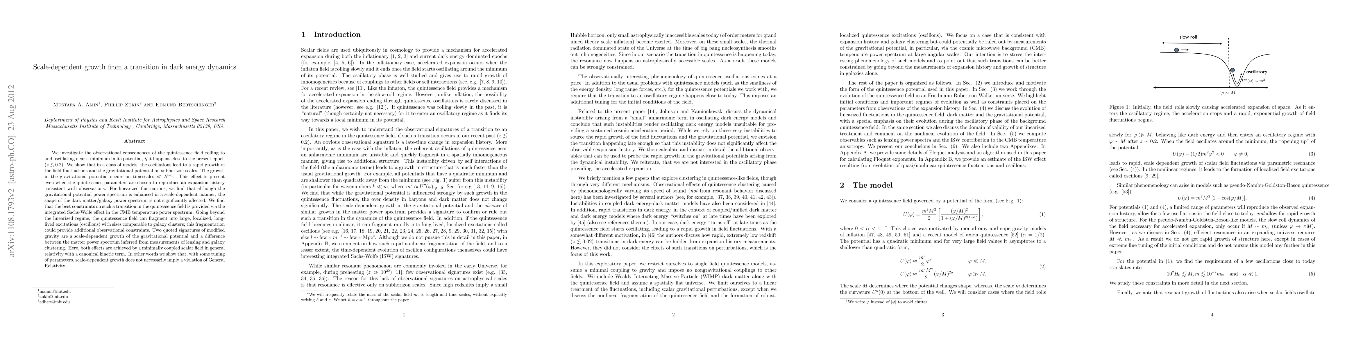 We investigate the observational consequences of the quintessence field rolling to and oscillating near a minimum in its potential, "if" it happens close to the present epoch (z<0.2). We show that in a class of models, the oscillations lead to a rapid growth of the field fluctuations and the gravitational potential on subhorizon scales. The growth in the gravitational potential occurs on timescales << H^(1). This effect is present even when the quintessence parameters are chosen to reproduce an expansion history consistent with observations. For linearized fluctuations, we find that although the gravitational potential power spectrum is enhanced in a scale-dependent manner, the shape of the dark matter/galaxy power spectrum is not significantly affected. We find that the best constraints on such a transition in the quintessence field is provided via the integrated Sachs-Wolfe (ISW) effect in the CMB temperature power spectrum. Going beyond the linearized regime, the quintessence field can fragment into large, localized, long lived excitations (oscillons) with sizes comparable to galaxy clusters; this fragmentation could provide additional observational constraints. Two quoted "signatures" of modified gravity are a scale-dependent growth of the gravitational potential and a difference between the matter power spectrum inferred from measurements of lensing and galaxy clustering. Here, both effects are achieved by a minimally coupled scalar field in general relativity with a canonical kinetic term.