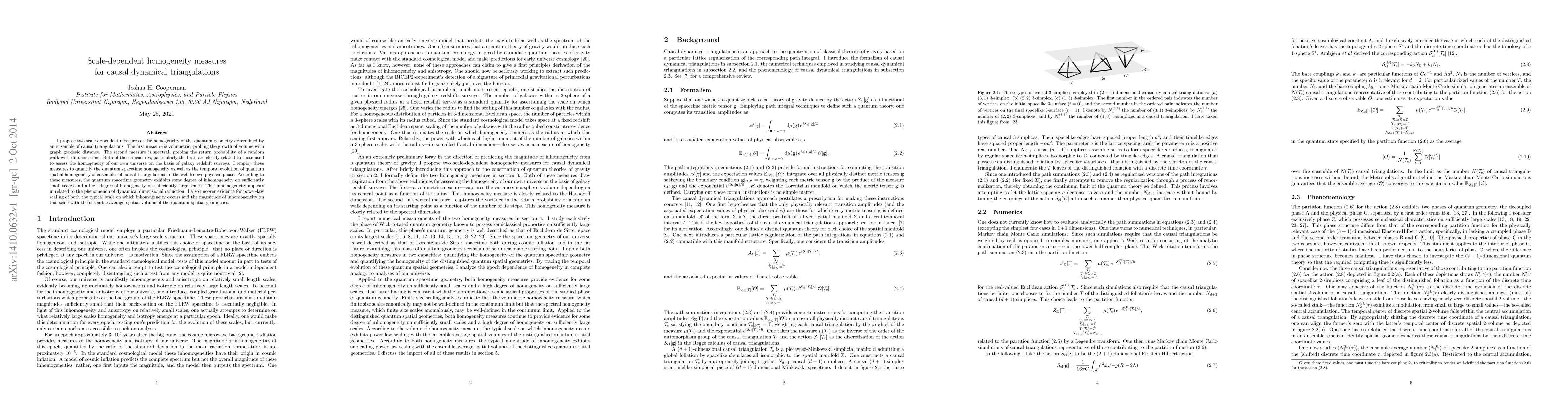 This paper introduces two scale-dependent measures to assess the homogeneity of quantum geometry from causal dynamical triangulations, revealing inhomogeneity on small scales and homogeneity on large scales, with evidence of power-law scaling related to the ensemble's spatial volume.