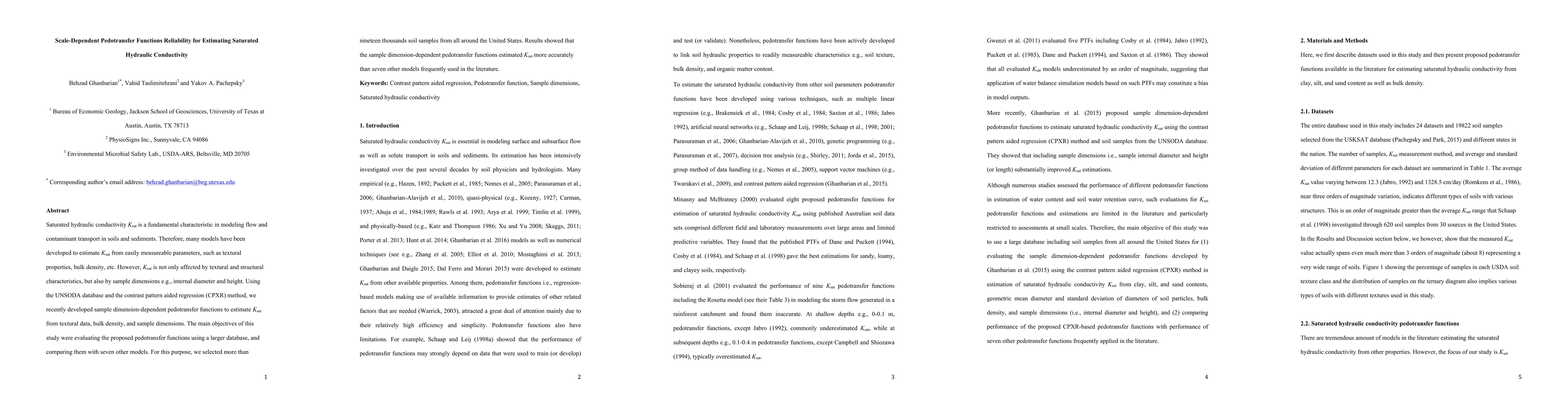 New pedotransfer functions were developed to estimate saturated hydraulic conductivity from soil textural data, bulk density, and sample dimensions, outperforming other models in accuracy.