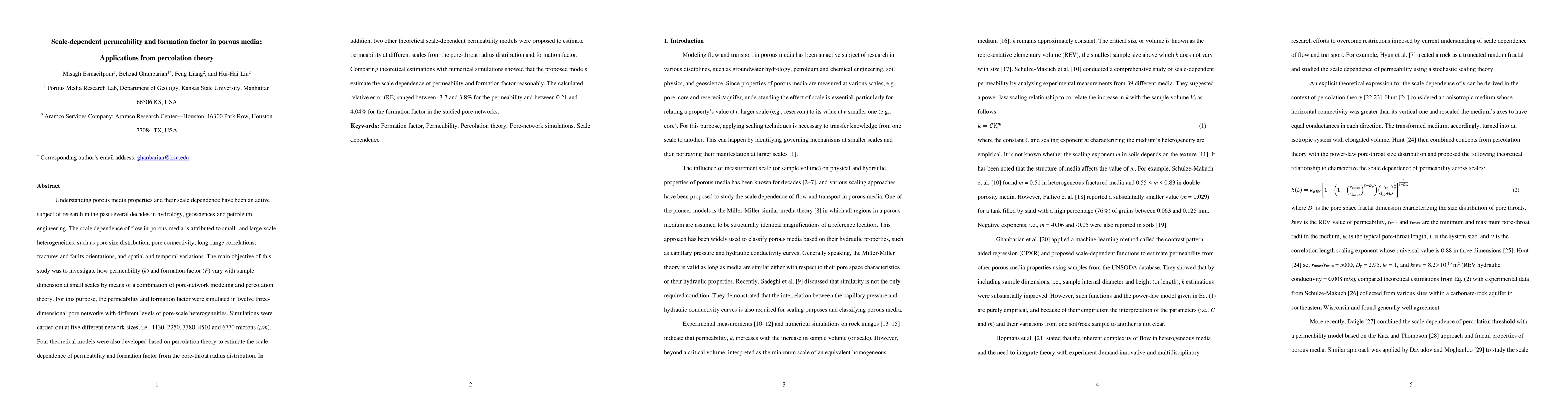 This study investigates how permeability and formation factor in porous media vary with sample size using pore-network modeling and percolation theory. Theoretical models based on percolation theory were developed to estimate scale-dependent permeability and formation factor, showing reasonable agreement with numerical simulations, with relative errors ranging from -3.7% to 4.04%.