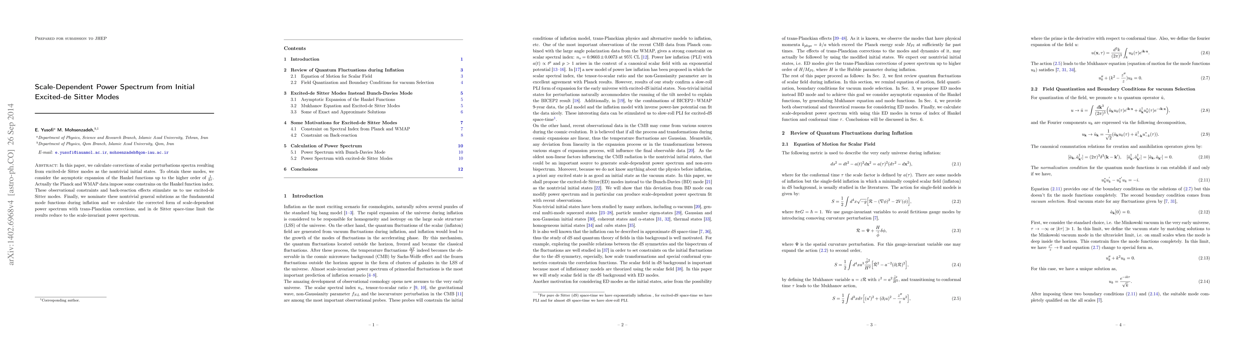 In this paper, we calculate corrections of scalar perturbations spectra resulting from excited-de Sitter modes as the nontrivial initial states. To obtain these modes, we consider the asymptotic expansion of the Hankel functions up to the higher order of 1/k{\tau} . Actually the Planck and WMAP data impose some constrains on the Hankel function index. These observational constraints and back-reaction effects stimulate us to use excited-de Sitter modes. Finally, we nominate these nontrivial general solutions as the fundamental mode functions during inflation and we calculate the corrected form of scale-dependent power spectrum with trans-Planckian corrections, and in de Sitter space-time limit the results reduce to the scale-invariant power spectrum.