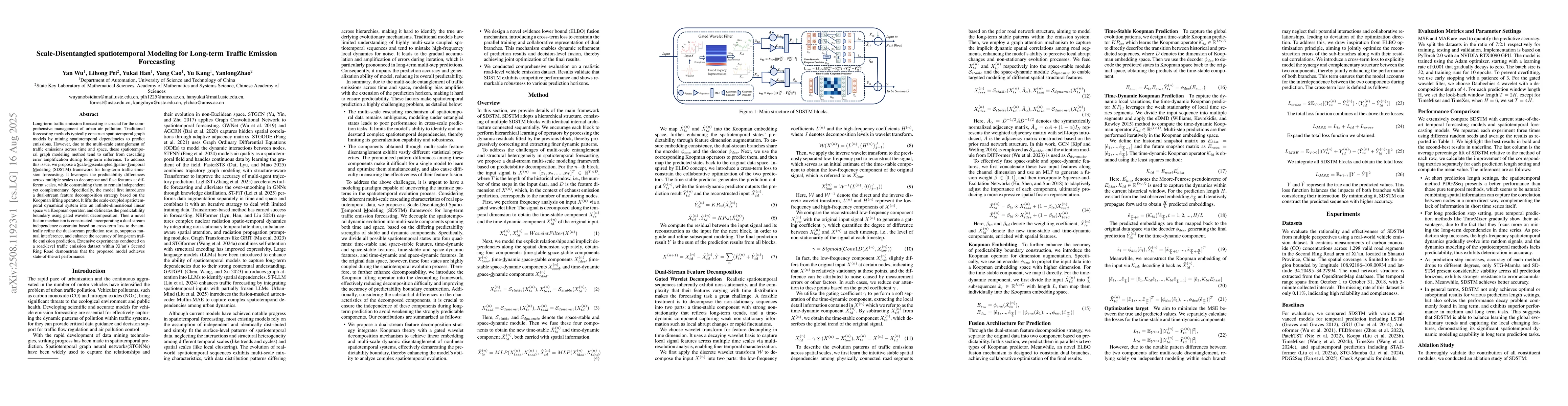 Long-term traffic emission forecasting is crucial for the comprehensive management of urban air pollution. Traditional forecasting methods typically construct spatiotemporal graph models by mining spatiotemporal dependencies to predict emissions. However, due to the multi-scale entanglement of traffic emissions across time and space, these spatiotemporal graph modeling method tend to suffer from cascading error amplification during long-term inference. To address this issue, we propose a Scale-Disentangled Spatio-Temporal Modeling (SDSTM) framework for long-term traffic emission forecasting. It leverages the predictability differences across multiple scales to decompose and fuse features at different scales, while constraining them to remain independent yet complementary. Specifically, the model first introduces a dual-stream feature decomposition strategy based on the Koopman lifting operator. It lifts the scale-coupled spatiotemporal dynamical system into an infinite-dimensional linear space via Koopman operator, and delineates the predictability boundary using gated wavelet decomposition. Then a novel fusion mechanism is constructed, incorporating a dual-stream independence constraint based on cross-term loss to dynamically refine the dual-stream prediction results, suppress mutual interference, and enhance the accuracy of long-term traffic emission prediction. Extensive experiments conducted on a road-level traffic emission dataset within Xi'an's Second Ring Road demonstrate that the proposed model achieves state-of-the-art performance.