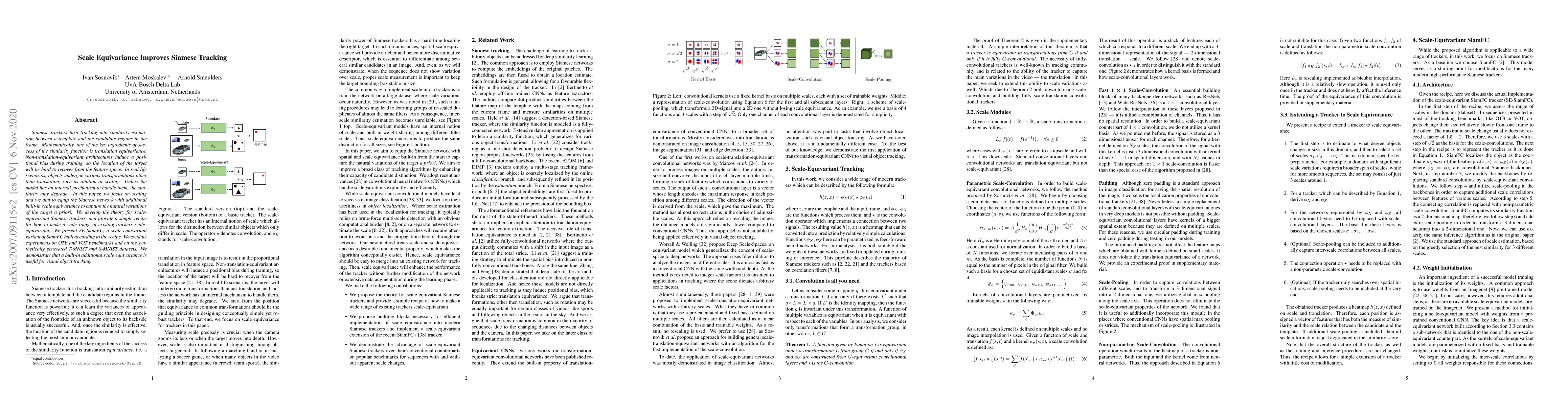 This paper proposes a method to enhance Siamese trackers with scale equivariance to better handle object transformations like scaling. The authors develop a theoretical framework and a practical recipe to make existing trackers scale-equivariant, demonstrating improved performance on various benchmarks.