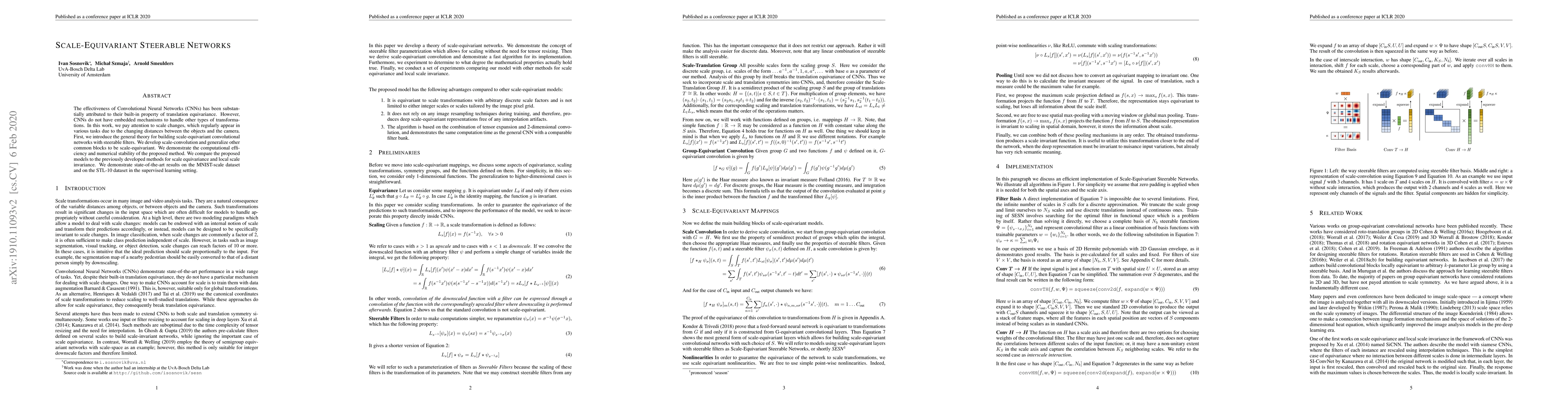 This paper introduces scale-equivariant convolutional networks using steerable filters to handle scale changes in images, achieving computational efficiency and numerical stability. The proposed method is shown to outperform previous methods in scale equivariance and local scale invariance, achieving state-of-the-art results on MNIST-scale and STL-10 datasets.