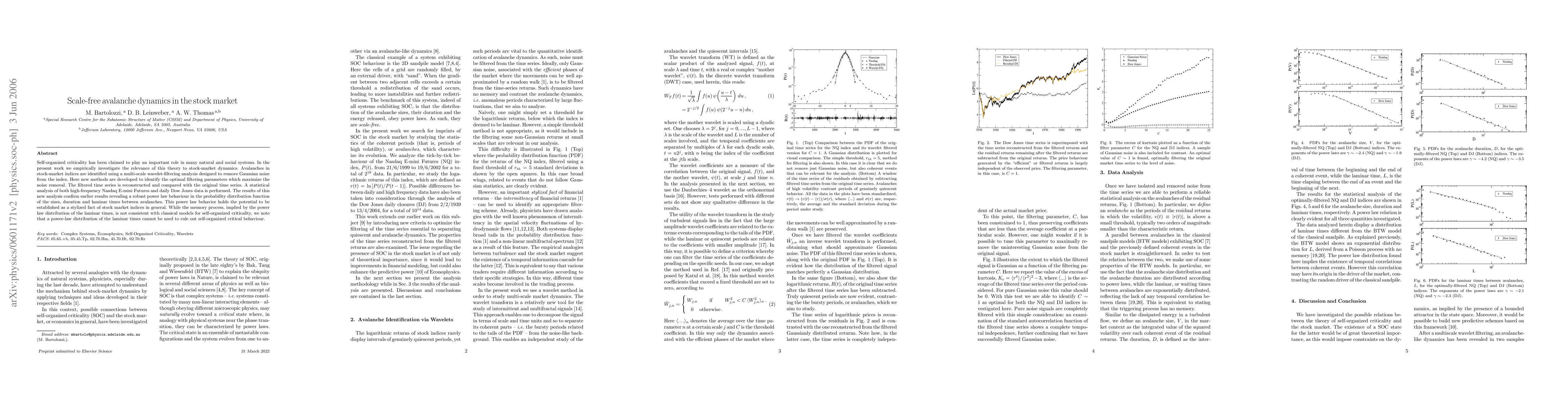 Self-organized criticality has been claimed to play an important role in many natural and social systems. In the present work we empirically investigate the relevance of this theory to stock-market dynamics. Avalanches in stock-market indices are identified using a multi-scale wavelet-filtering analysis designed to remove Gaussian noise from the index. Here new methods are developed to identify the optimal filtering parameters which maximize the noise removal. The filtered time series is reconstructed and compared with the original time series. A statistical analysis of both high-frequency Nasdaq E-mini Futures and daily Dow Jones data is performed. The results of this new analysis confirm earlier results revealing a robust power law behaviour in the probability distribution function of the sizes, duration and laminar times between avalanches. This power law behavior holds the potential to be established as a stylized fact of stock market indices in general. While the memory process, implied by the power law distribution of the laminar times, is not consistent with classical models for self-organized criticality, we note that a power-law distribution of the laminar times cannot be used to rule out self-organized critical behaviour.