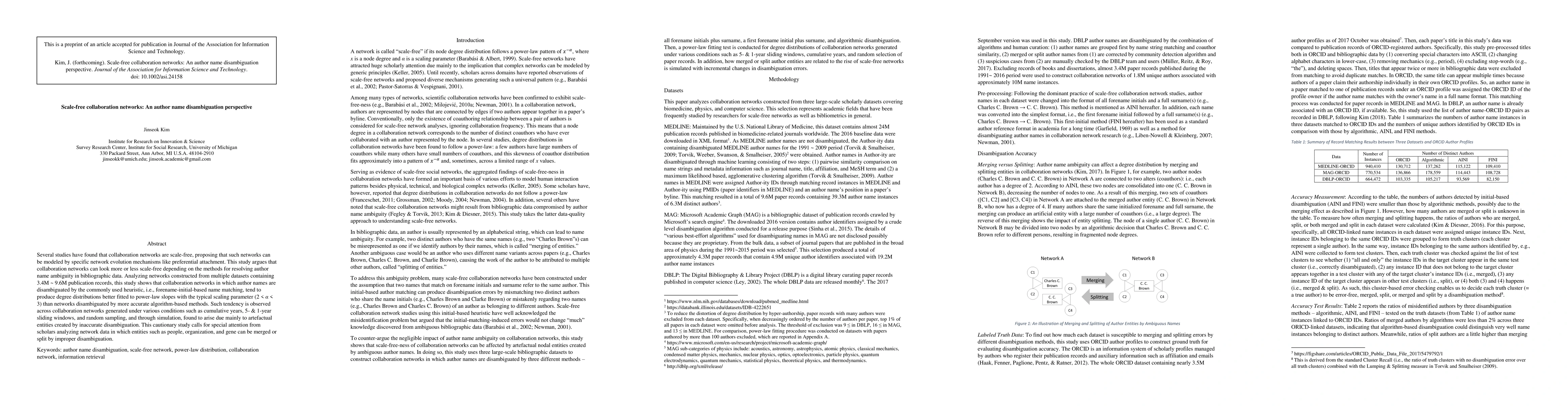 Collaboration networks can appear scale-free depending on how author names are disambiguated, with inaccurate methods creating artefactual entities that skew the network's degree distribution.