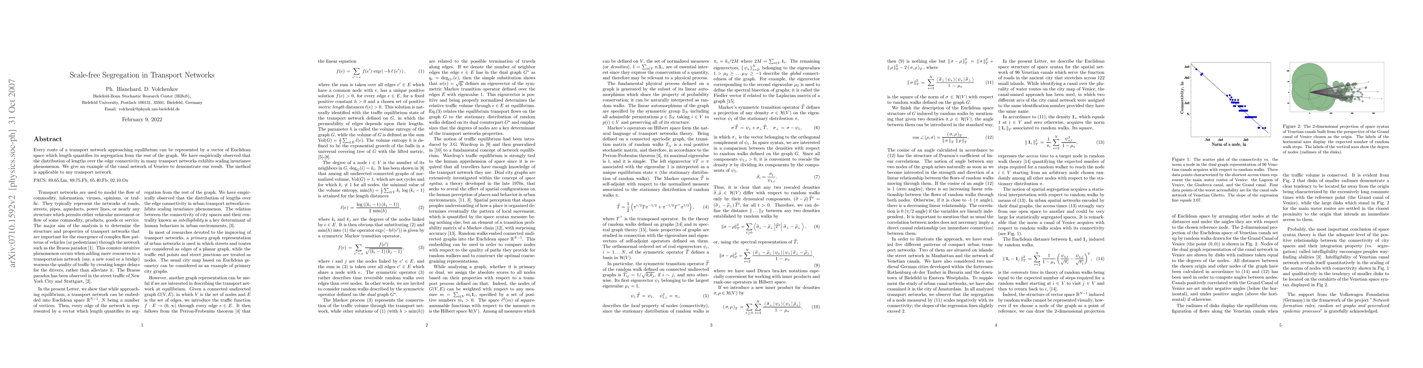 Every route of a transport network approaching equilibrium can be represented by a vector of Euclidean space which length quantifies its segregation from the rest of the graph. We have empirically observed that the distribution of lengths over the edge connectivity in many transport networks exhibits scaling invariance phenomenon. We give an example of the canal network of Veneice to demonstrate our result. The method is applicable to any transport network.