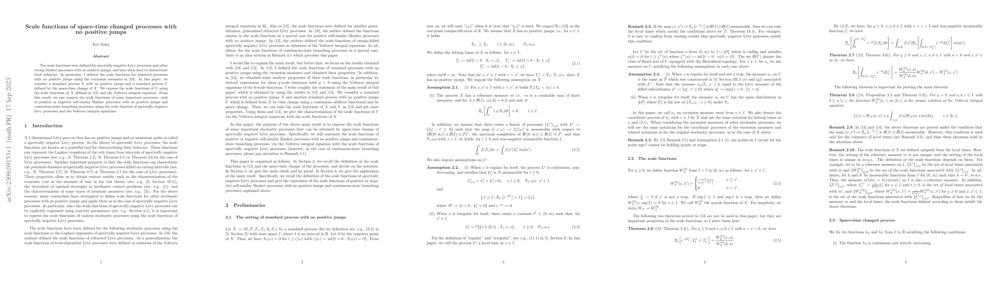 This paper defines scale functions for standard processes without positive jumps and explores how these scale functions transform under space-time changes. It expresses the scale functions of space-time changed processes using the original scale functions and Volterra integral equations, extending this to self-similar Markov processes and continuous-state branching processes.