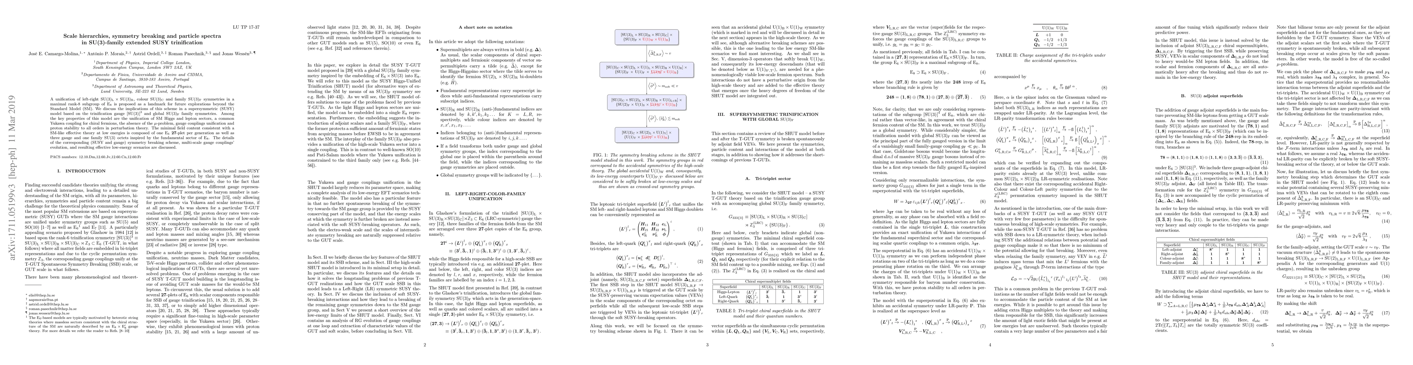 A unification of left-right $\rm{SU}(3)_\rm{L}\times \rm{SU}(3)_\rm{R}$, colour $\rm{SU}(3)_\rm{C}$ and family $\rm{SU}(3)_\rm{F}$ symmetries in a maximal rank-8 subgroup of ${\rm{E}}_8$ is proposed as a landmark for future explorations beyond the Standard Model (SM). We discuss the implications of this scheme in a supersymmetric (SUSY) model based on the trinification gauge $\left[\rm{SU}(3)\right]^3$ and global $\rm{SU}(3)_\rm{F}$ family symmetries. Among the key properties of this model are the unification of SM Higgs and lepton sectors, a common Yukawa coupling for chiral fermions, the absence of the $\mu$-problem, gauge couplings unification and proton stability to all orders in perturbation theory. The minimal field content consistent with a SM-like effective theory at low energies is composed of one $\mathrm{E}_6$ $27$-plet per generation as well as three gauge and one family $\rm{SU}(3)$ octets inspired by the fundamental sector of ${\rm{E}}_8$. The details of the corresponding (SUSY and gauge) symmetry breaking scheme, multi-scale gauge couplings' evolution, and resulting effective low-energy scenarios are discussed.