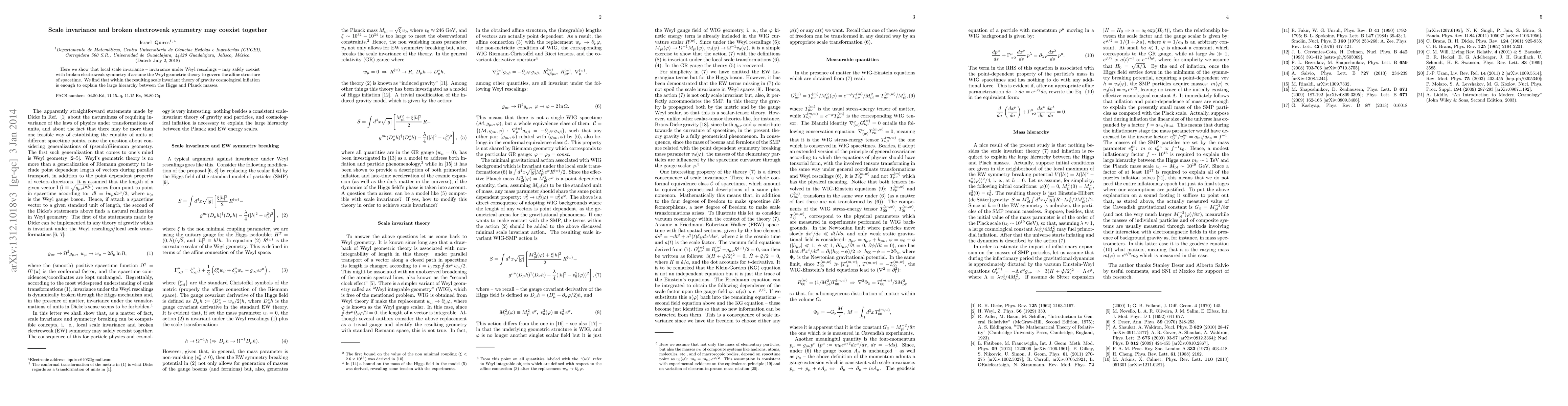Summary: This paper demonstrates that local scale invariance can coexist with broken electroweak symmetry in a Weyl geometric theory, where cosmological inflation resolves the large mass hierarchy between the Higgs and Planck masses.