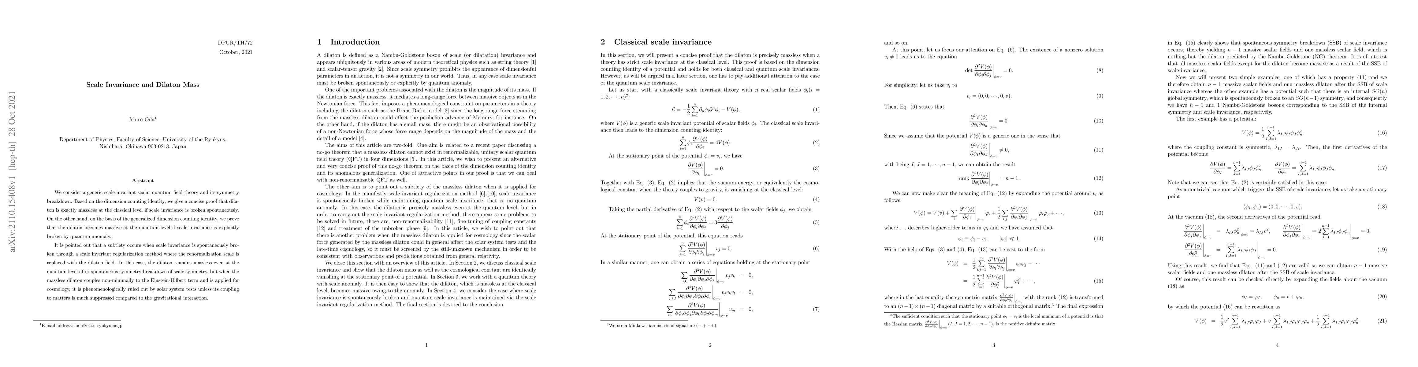 We consider a generic scale invariant scalar quantum field theory and its symmetry breakdown. Based on the dimension counting identity, we give a concise proof that dilaton is exactly massless at the classical level if scale invariance is broken spontaneously. On the other hand, on the basis of the generalized dimension counting identity, we prove that the dilaton becomes massive at the quantum level if scale invariance is explicitly broken by quantum anomaly. It is pointed out that a subtlety occurs when scale invariance is spontaneously broken through a scale invariant regularization method where the renormalization scale is replaced with the dilaton field. In this case, the dilaton remains massless even at the quantum level after spontaneous symmetry breakdown of scale symmetry, but when the massless dilaton couples non-minimally to the Einstein-Hilbert term and is applied for cosmology, it is phenomenologically ruled out by solar system tests unless its coupling to matters is much suppressed compared to the gravitational interaction.