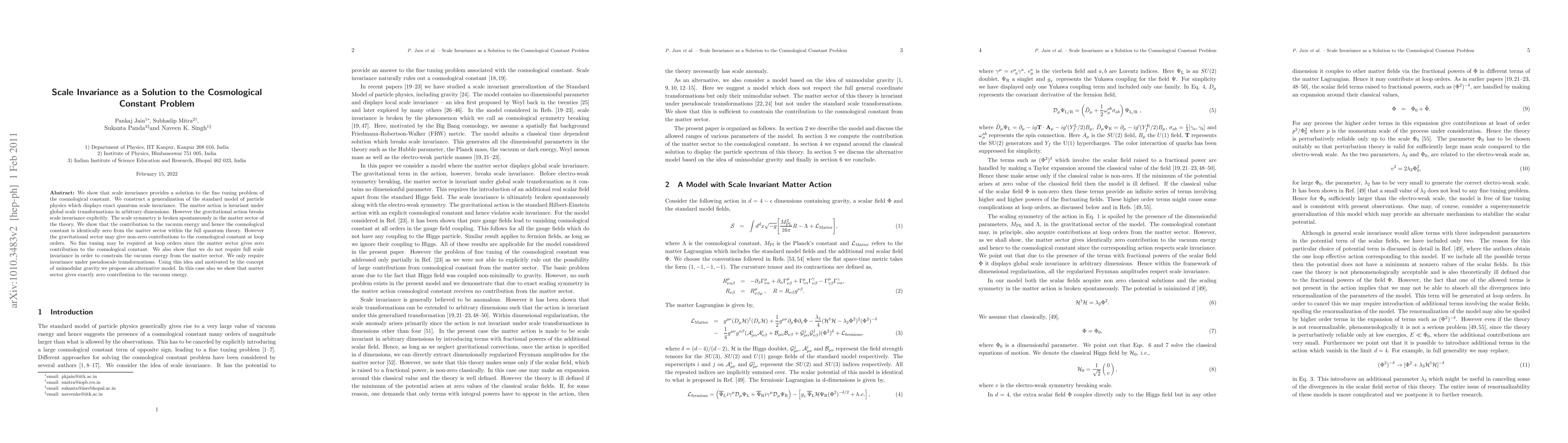 We show that scale invariance provides a solution to the fine tuning problem of the cosmological constant. We construct a generalization of the standard model of particle physics which displays exact quantum scale invariance. The matter action is invariant under global scale transformations in arbitrary dimensions. However the gravitational action breaks scale invariance explicitly. The scale symmetry is broken spontaneously in the matter sector of the theory. We show that the contribution to the vacuum energy and hence the cosmological constant is identically zero from the matter sector within the full quantum theory. However the gravitational sector may give non-zero contributions to the cosmological constant at loop orders. No fine tuning may be required at loop orders since the matter sector gives zero contribution to the cosmological constant. We also show that we do not require full scale invariance in order to constrain the vacuum energy from the matter sector. We only require invariance under pseudoscale transformations. Using this idea and motivated by the concept of unimodular gravity we propose an alternative model. In this case also we show that matter sector gives exactly zero contribution to the vacuum energy.