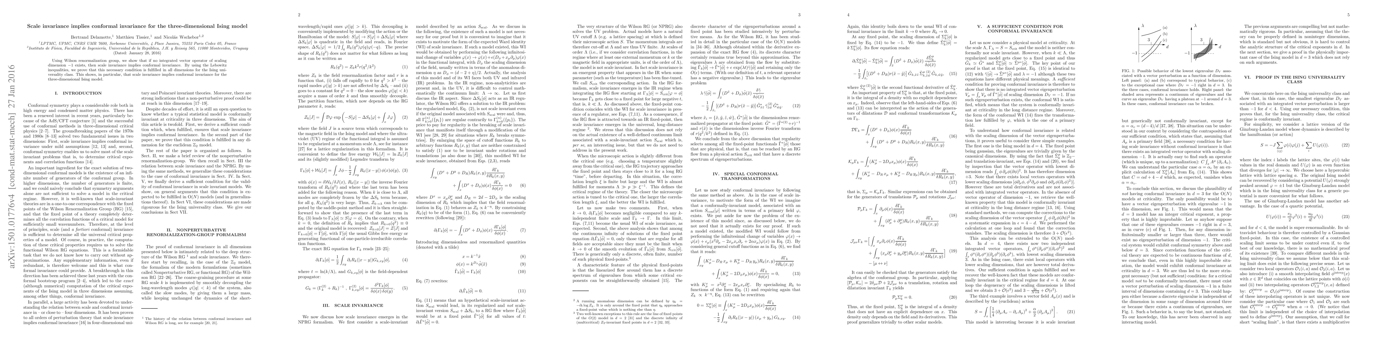The paper presents a rigorous proof that scale invariance implies conformal invariance for the Ising model using Wilson RG and Lebowitz inequalities, generalizable to all dimensions within the Ising universality class.