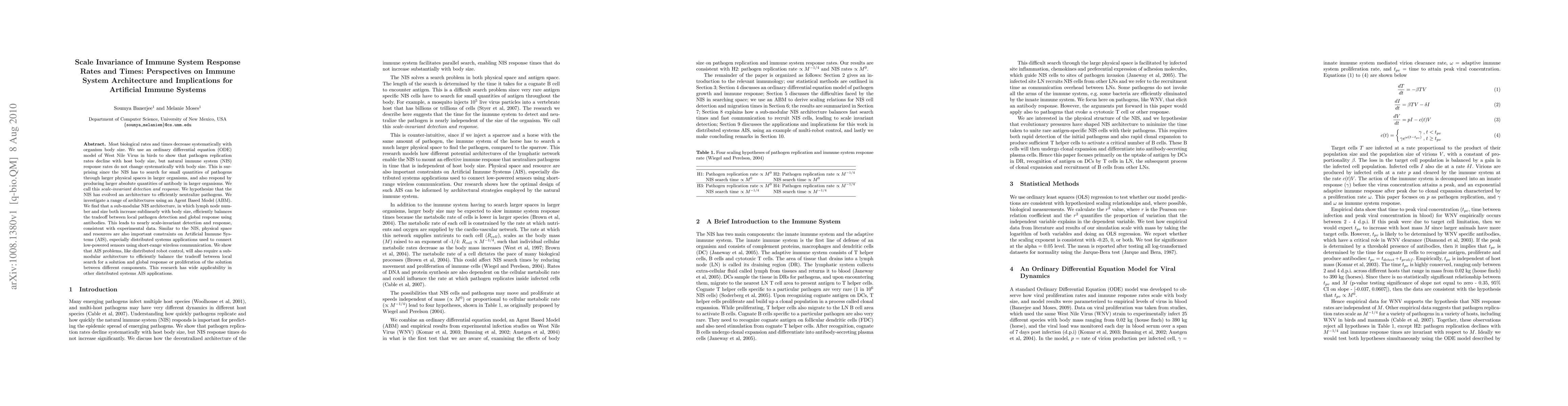 Most biological rates and times decrease systematically with organism body size. We use an ordinary differential equation (ODE) model of West Nile Virus in birds to show that pathogen replication rates decline with host body size, but natural immune system (NIS) response rates do not change systematically with body size. This is surprising since the NIS has to search for small quantities of pathogens through larger physical spaces in larger organisms, and also respond by producing larger absolute quantities of antibody in larger organisms. We call this scale-invariant detection and response. We hypothesize that the NIS has evolved an architecture to efficiently neutralize pathogens. We investigate a range of architectures using an Agent Based Model (ABM). We find that a sub-modular NIS architecture, in which lymph node number and size both increase sublinearly with body size, efficiently balances the tradeoff between local pathogen detection and global response using antibodies. This leads to nearly scale-invariant detection and response, consistent with experimental data. Similar to the NIS, physical space and resources are also important constraints on Artificial Immune Systems (AIS), especially distributed systems applications used to connect low-powered sensors using short-range wireless communication. We show that AIS problems, like distributed robot control, will also require a sub-modular architecture to efficiently balance the tradeoff between local search for a solution and global response or proliferation of the solution between different components. This research has wide applicability in other distributed systems AIS applications.