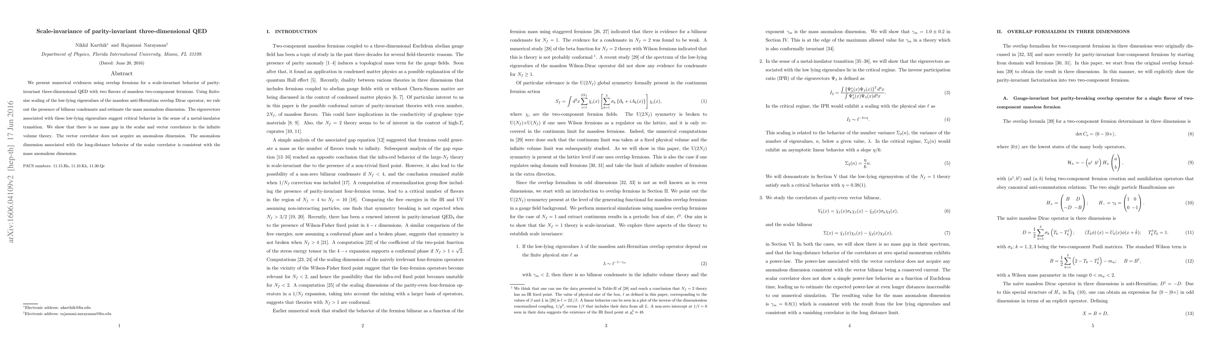 We present numerical evidences using overlap fermions for a scale-invariant behavior of parity-invariant three-dimensional QED with two flavors of massless two-component fermions. Using finite-size scaling of the low-lying eigenvalues of the massless anti-Hermitian overlap Dirac operator, we rule out the presence of bilinear condensate and estimate the mass anomalous dimension. The eigenvectors associated with these low-lying eigenvalues suggest critical behavior in the sense of a metal-insulator transition. We show that there is no mass gap in the scalar and vector correlators in the infinite volume theory. The vector correlator does not acquire an anomalous dimension. The anomalous dimension associated with the long-distance behavior of the scalar correlator is consistent with the mass anomalous dimension.